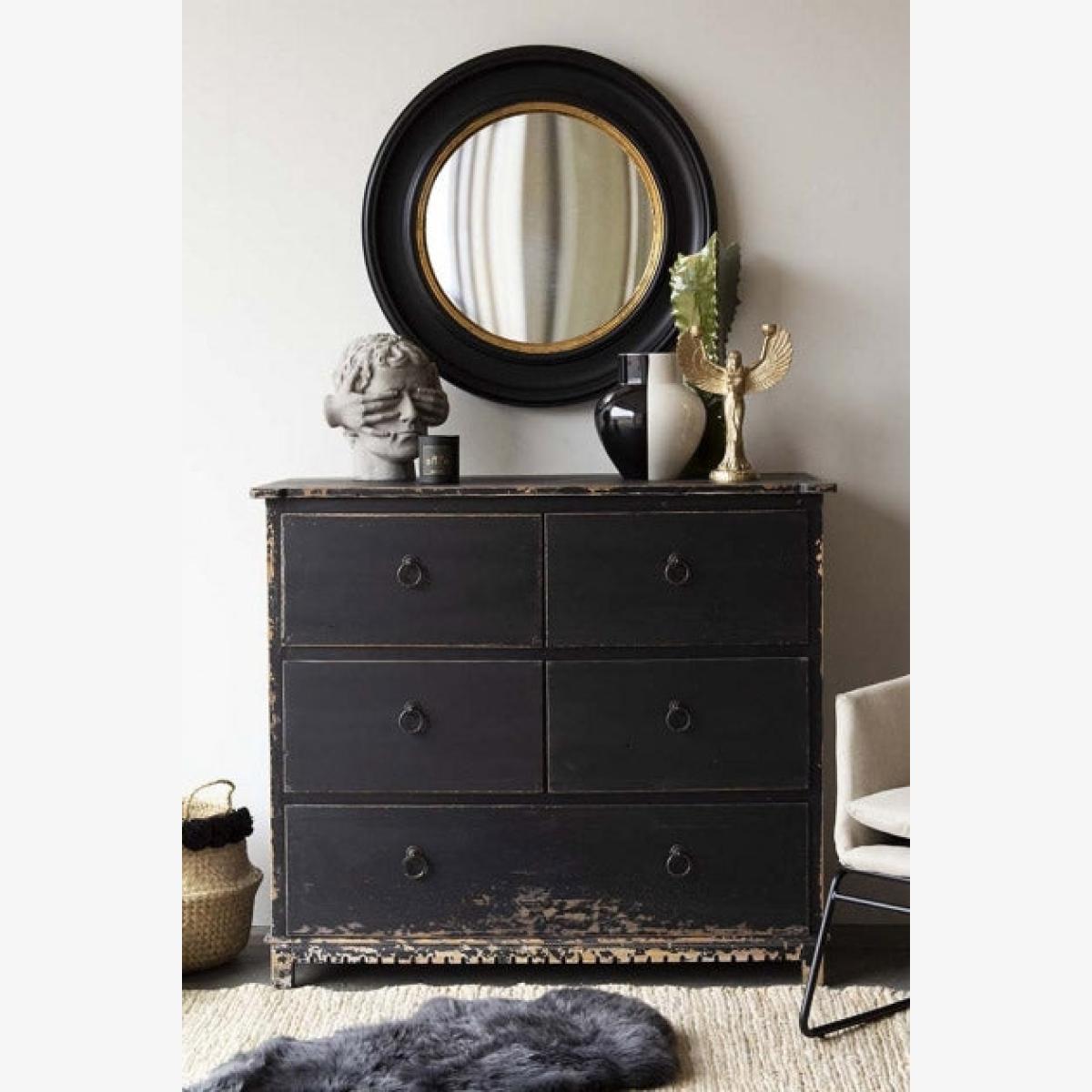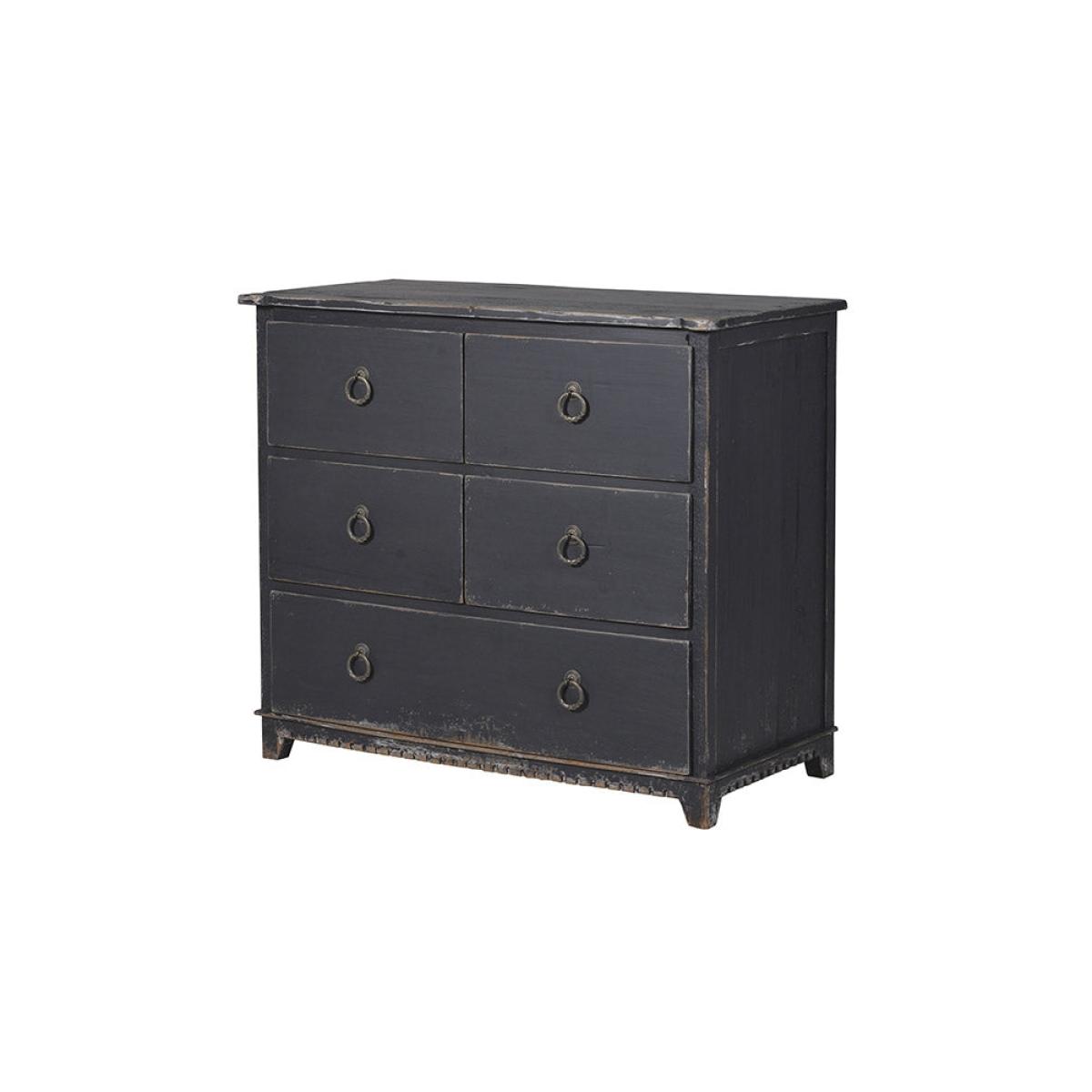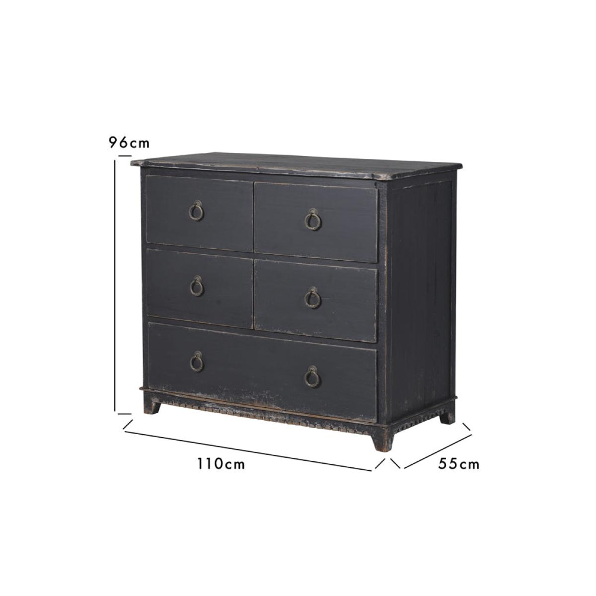 About The Distressed Vintage Style 5-Drawer Chest Of DrawersA fabulously unique black chest of drawers, the large bedroom furniture piece features five drawers for all your clothes and storage pieces. A bedroom essential, the distressed detailing of the cabinet adds character and boho eclectic charm to the piece… an authentic and gorgeous detail that will make the Distressed Vintage Style 5-Drawer Chest Of Drawers stand out in your home. Why We Think You'll Love The Vintage Style Chest Of DrawersThe Vintage Style Chest Of Drawers is a gorgeous piece of furniture for any room, but in particular, we think it will look best in a bedroom. The deep drawers are perfect for storing clothing. And the wide top is ideal for displaying personal memories, vases and a statement mirror. What's more, the aged black finish means it will work with most interior styles, and will become a piece you treasure forever. Guests will think the Distressed Vintage Style 5-Drawer Chest of Drawers is antique … it’s entirely up to you what story you tell!