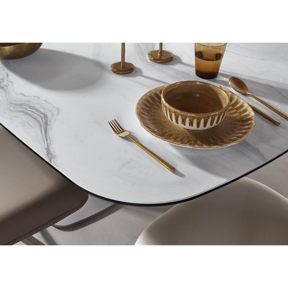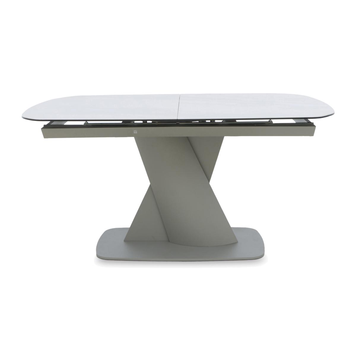 This is one Diva you’ll want to bring home. With showstopping looks and incredible durability, the dining tables and dining sets in this range deliver a winning combination of form and function. Oval-shaped dining tables with statement X-shaped pedestal bases feature clever swivel top mechanisms. Dining table and sideboard tops are made with matt-finished white ceramic bonded to tempered glass for family-friendly durability. And the range’s dining chairs are modern and glam in style with deep cushioning, auto return swivel bases and metal legs in a choice of finish. The Diva collection is destined to bring drama to your dining room – in the most stylish of ways. Enjoy bold modern style on a striking scale with our Diva range. With its gorgeous matt ceramic top and statement taupe metal pedestal base, this extending dining table is showstopping in every way. Why you'll love it Our Diva collection delivers truly one-of-a-kind style. Guaranteed to transform your dining space and wow your guests. Showstopping oval extending dining table has a matt-finished white ceramic top. Stunning X-shaped powder-coated metal pedestal base in fashionable taupe. Super-smooth swivel mechanism extends this table in seconds. Bonded to tempered glass, the ceramic table top is incredibly hardwearing. Ceramic is also heatproof, scratch-resistant and chip-resistant. Available in 2 sizes. This extending dining table is part of our Diva range. What you need to know The small 160 cm dining table seats 6 closed and 8 when extended to 200 cm. The large 180 cm dining table seats 8 closed and 10 when extended to 230 cm. This dining table is very heavy and should not be moved once in place. We recommend using coasters and placemats at all times. Easy to care for. Simply wipe with a clean, damp cloth and dry with a soft duster. Do not use abrasive cleaning products. Item code: DIVATBL1WHT-001