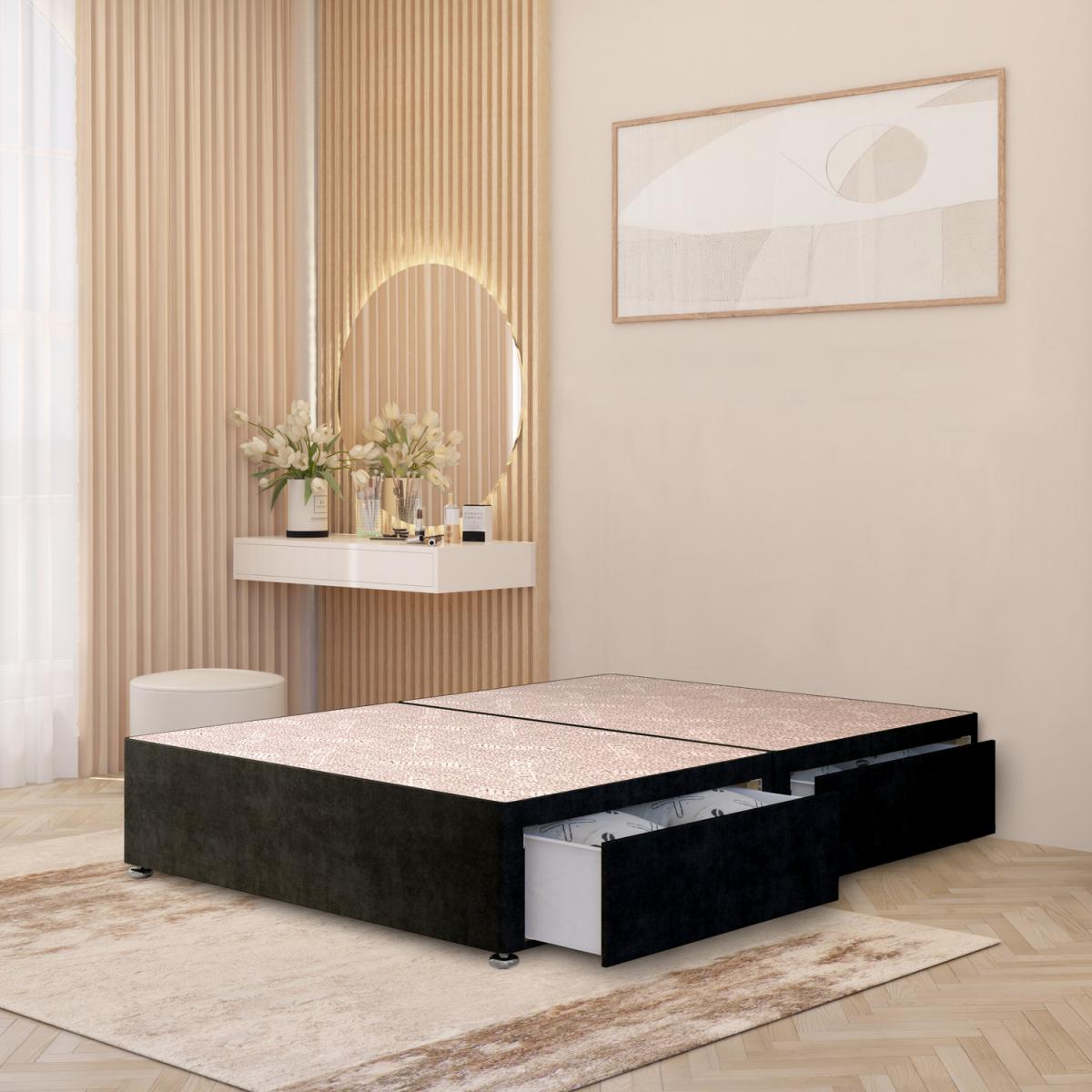 The Plush Velvet Divan Bed Base combines durability, practicality, and modern style. Expertly handcrafted in the UK from strong timber, this solid platform top divan base provides the perfect foundation for your mattress, enhancing comfort and extending its life. Upholstered in luxurious plush velvet fabric, it brings a soft, elegant finish to any bedroom. Choose from no drawers, 2 drawers, or 4 drawers for a versatile storage bed solution that keeps your space organised. Designed for lasting strength, the base sits at a practical height with gliders for easy movement and stability. 30.5cm without the glides, or 34.5cm with the glides attached. This 2 Draw Bed Base comes with easy access storage drawers. Headboards can be attached on either end of the base.
