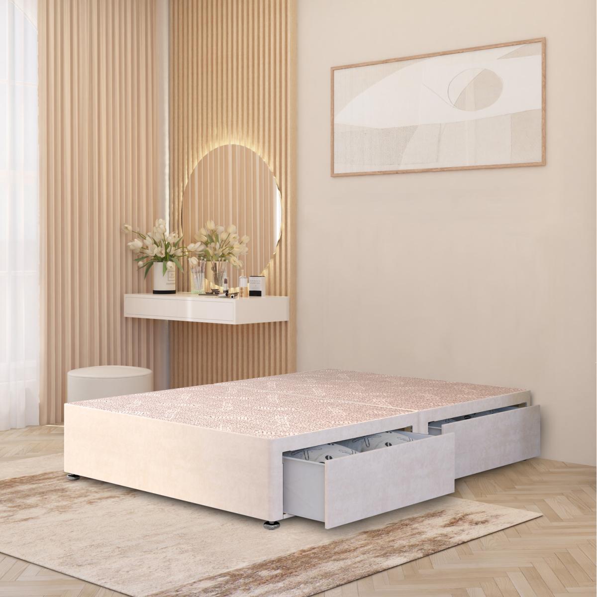 The Plush Velvet Divan Bed Base combines durability, practicality, and modern style. Expertly handcrafted in the UK from strong timber, this solid platform top divan base provides the perfect foundation for your mattress, enhancing comfort and extending its life. Upholstered in luxurious plush velvet fabric, it brings a soft, elegant finish to any bedroom. Choose from no drawers, 2 drawers, or 4 drawers for a versatile storage bed solution that keeps your space organised. Designed for lasting strength, the base sits at a practical height with gliders for easy movement and stability. 30.5cm without the glides, or 34.5cm with the glides attached. This 2 Draw Bed Base comes with easy access storage drawers. Headboards can be attached on either end of the base.