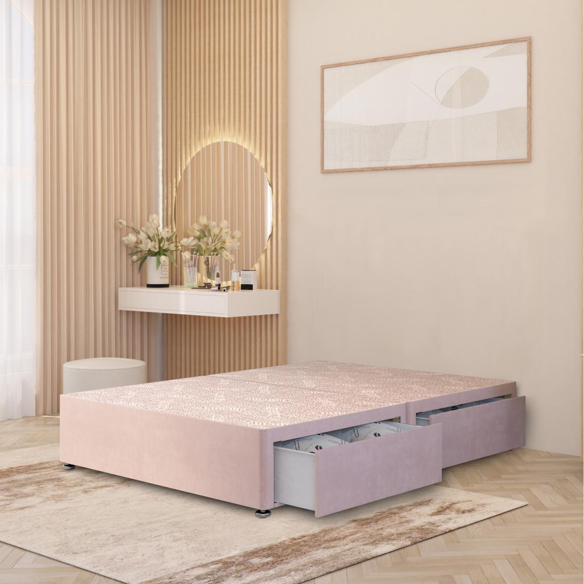 The Plush Velvet Divan Bed Base combines durability, practicality, and modern style. Expertly handcrafted in the UK from strong timber, this solid platform top divan base provides the perfect foundation for your mattress, enhancing comfort and extending its life. Upholstered in luxurious plush velvet fabric, it brings a soft, elegant finish to any bedroom. Choose from no drawers, 2 drawers, or 4 drawers for a versatile storage bed solution that keeps your space organised. Designed for lasting strength, the base sits at a practical height with gliders for easy movement and stability. 30.5cm without the glides, or 34.5cm with the glides attached. This 2 Draw Bed Base comes with easy access storage drawers. Headboards can be attached on either end of the base.