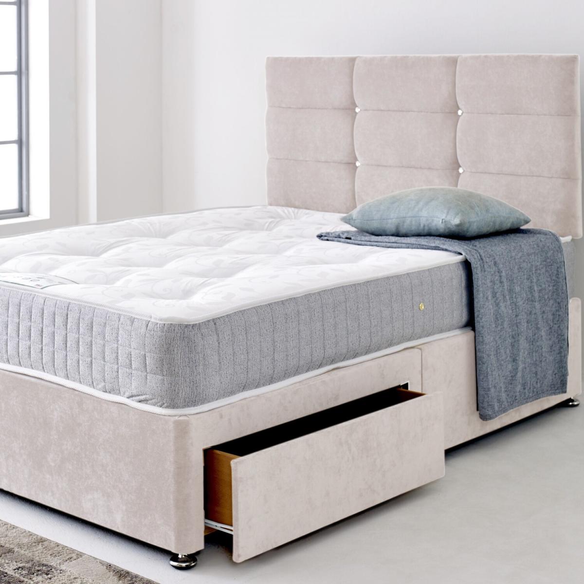 The Divan Bed has been made in the UK, crafted with precision and care, showcases the finest British craftmanship, ensuring long lasting quality. Elegant 24" inch headboard with a cube buttoned design giving it an elegant look and stylish finish, adding a touch of class to your bedroom. This Divan bed shows sophistication and elegance, adding a touch of luxury to your bedroom. Customise your style and express your unique taste with this luxury Divan Bed Set. Elevate your bedroom and experience the perfect blend of elegance, style and quality. Transform your space into a haven of comfort and sophistication.