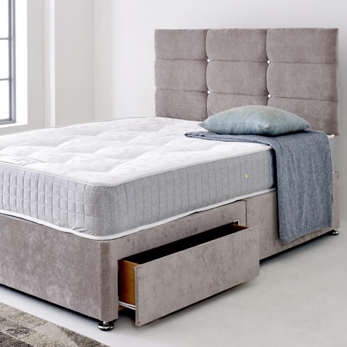The Divan Bed has been made in the UK, crafted with precision and care, showcases the finest British craftmanship, ensuring long lasting quality. Elegant 24" inch headboard with a cube buttoned design giving it an elegant look and stylish finish, adding a touch of class to your bedroom. This Divan bed shows sophistication and elegance, adding a touch of luxury to your bedroom. Customise your style and express your unique taste with this luxury Divan Bed Set. Elevate your bedroom and experience the perfect blend of elegance, style and quality. Transform your space into a haven of comfort and sophistication.