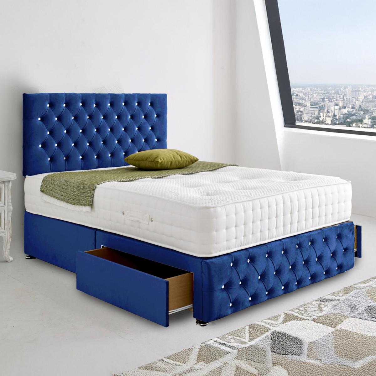 The luxurious Spanish Divan Bed showcases the finest British craftsmanship, made with precision and care ensuring lost lasting quality. This Divan Bed features matching 24 inch headboard and footboard with a stylish buttoned headboard adding a touch of class to any bedroom. Designed to pair seamlessly with your preferred mattress, allowing you to create the perfect sleep sanctuary. Crafted with the finest material, the bed boasts durability, comfort and promising years of restful night's sleep. Elevate your bedroom with the perfect blend of elegance, style and quality. This bed shows sophistication and elegance, adding a touch of luxury to your bedroom. Customise your style and express your unique taste with this luxury Divan Bed and Headboard. Elevate your bedroom with this luxurious Divan Bed and experience the perfect blend of elegance, style and quality. Transform your space in a haven of comfort and sophistication.