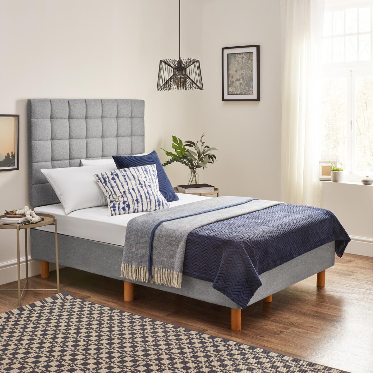 Elegant Divan bed with clean lines that will effortlessly slot into any bedroom interior. A large feature checkerboard headboard included makes the bed a standout piece of furniture. Robust internal steel frame that's stronger than wooden divan beds. Creates a solid base to ensure the bed lasts for years. 9 Thick stable wood legs for a stable heavy-duty bed. An extra padded headboard that is adjustable to mattress height, multiple anchor points and an optional wall bracket to prevent rocking. No slipcover grips the mattress with a matching grey linen outer that is mark and water-resistant. A plush headboard adaptable to your height adds cushioning for the sleeper. A unique slatted divan base provides extra bed ventilation during and between sleep. Raised legs give storage space underneath the bed with access from all sides Pocket sprung mattress option: Thick 16cm Luxury pocket sprung mattress with independent pocket springs to adapt to weight. Breathable cool touch hypoallergenic cover, anti-dust and anti-mite. High-density foam top sleeping layer medium-firm rating. Hybrid mattress option: Our highest comfort pocket sprung & memory foam hybrid mattress included. Breathable cool touch hypoallergenic cover, anti-dust and anti-mite. High-density foam & memory foam quilted top layer. Medium firm 16cm thick.