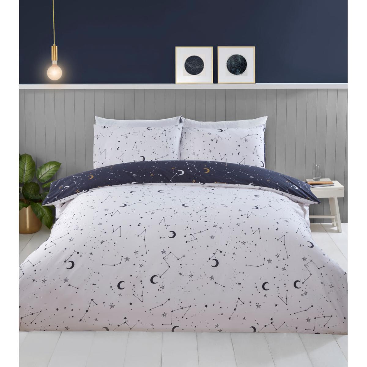 Featuring a stylish constellation print, this Divante Celestial Metallic Duvet Cover and Pillowcase Set is a must-have for all stargazers. With a navy background on one side and white on the other, this reversible duvet cover will look great in any bedroom with a fun space theme.