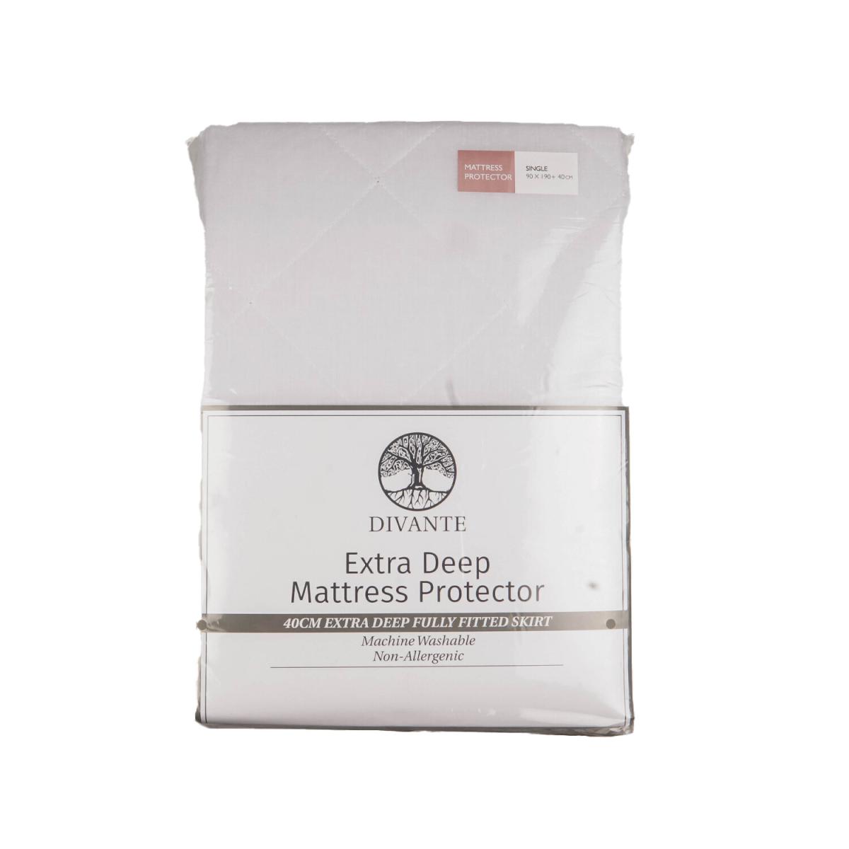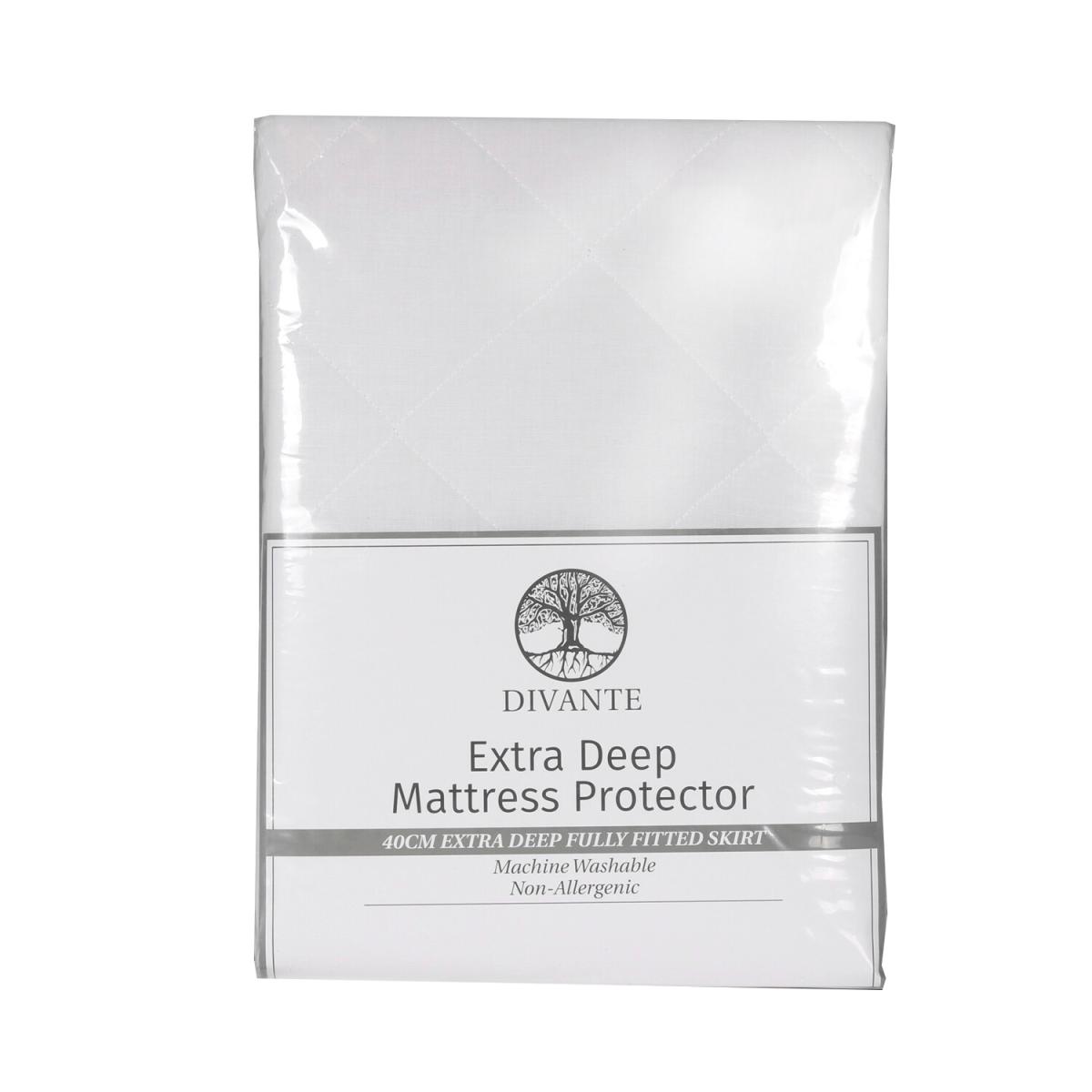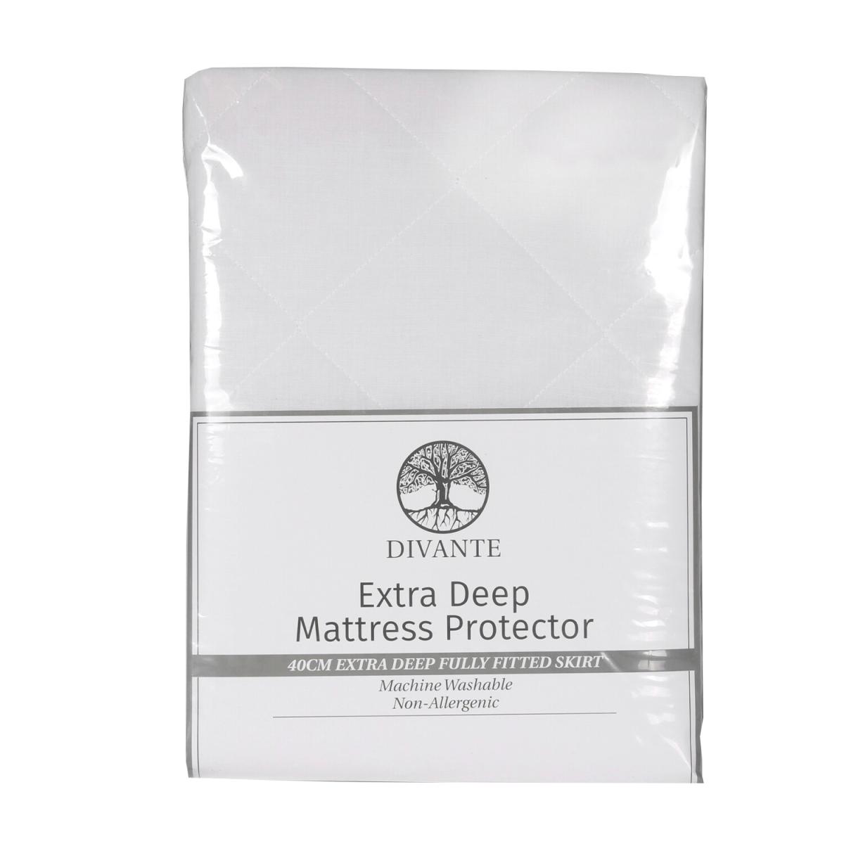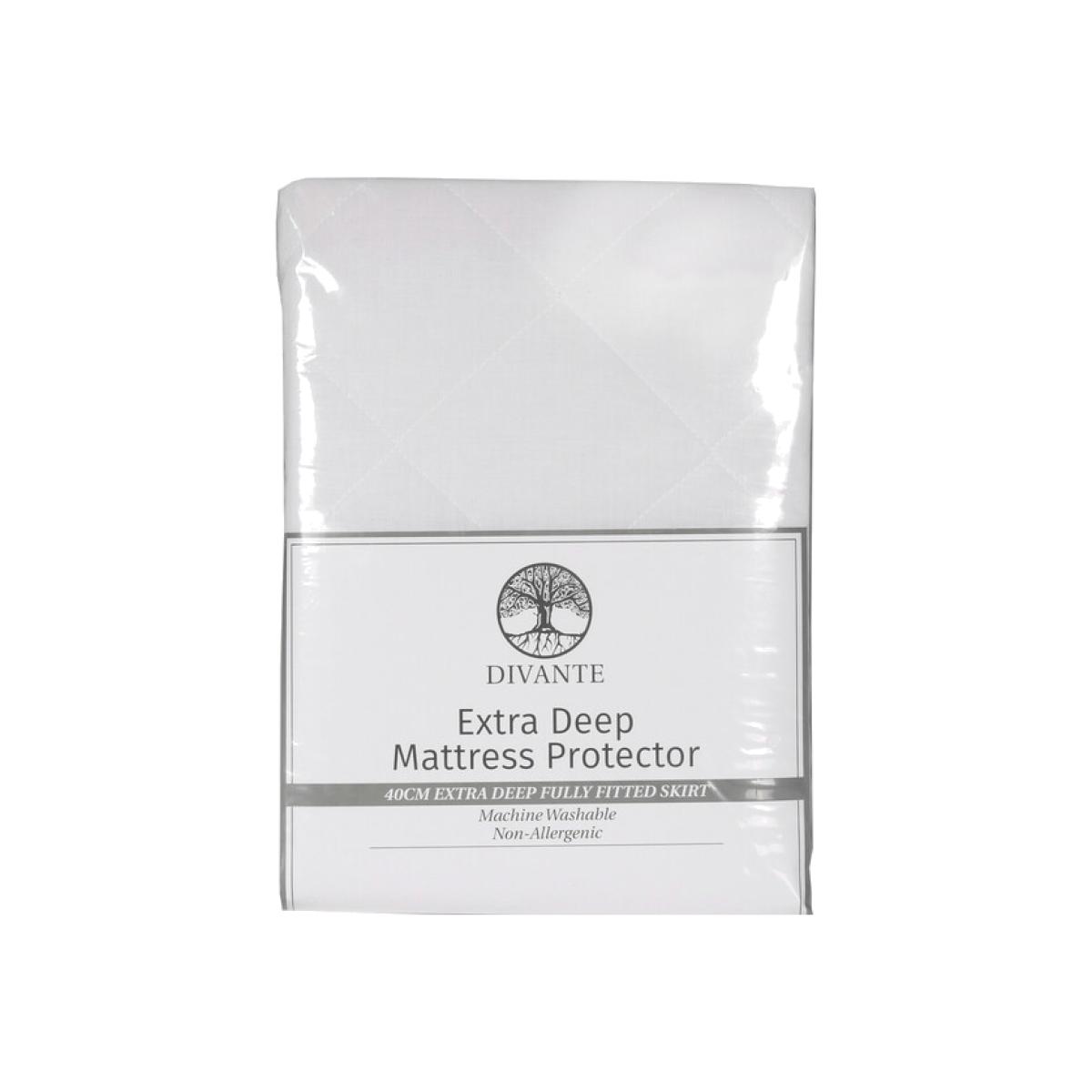 Keep your mattress looking newer and feeling fresher for longer with the Divante Extra Deep Mattress Protector. The 40cm/12inch fully-fitted skirt is a great fit for a bigger mattress depth or to secure a mattress and a separate topper. The combination of cotton and polyester means you have a fresh and robust fabric which is perfect for adding an extra layer of protection to your bedding.