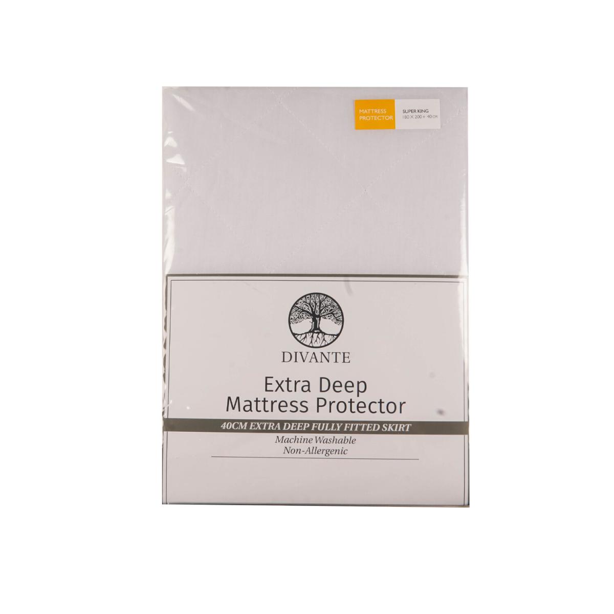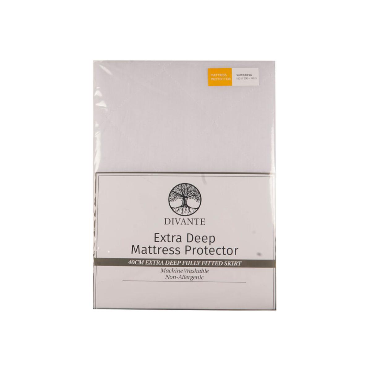 Keep your mattress looking newer and feeling fresher for longer with the Divante Extra Deep Mattress Protector. The 40cm/12inch fully-fitted skirt is a great fit for a bigger mattress depth or to secure a mattress and a separate topper. The combination of cotton and polyester means you have a fresh and robust fabric which is perfect for adding an extra layer of protection to your bedding.