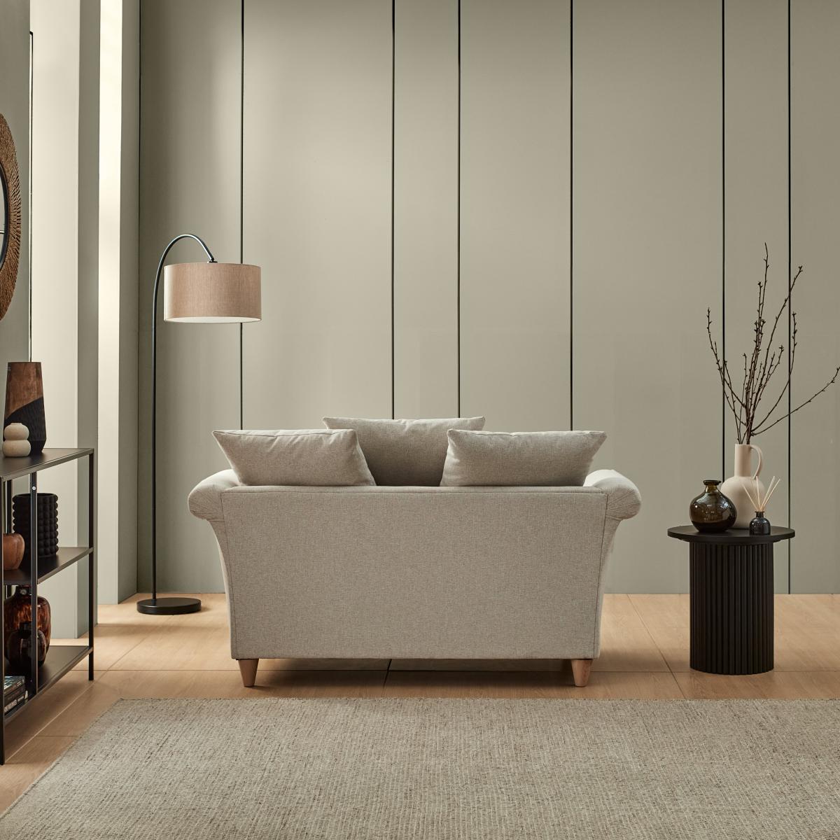 I love this two-seater because of its versatile, soft-textured fabric that lends a cozy, approachable feel to any space. It's perfect for relaxed, contemporary interiors, especially those with neutral or earthy tones. Style it with a mix of cushions in different textures and colours for added depth, or pair it with a statement armchair to create a comfortable reading corner. Practical tips include keeping the fabric clean with a upholstery protector and choosing simple, streamlined accessories to let the sofa be the focal point. This piece works well in small living rooms or versatile spaces where a welcoming, understated aesthetic is desired.
