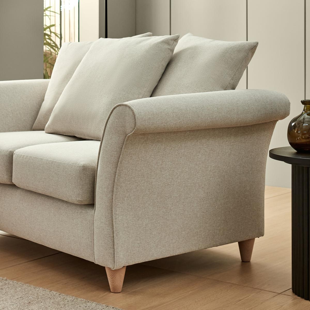 * Upholstered Sofa* Soft Fabric* Curved Arms* Scatter Back Effortlessly blending contemporary style with unparalleled comfort, this sofa boasts a soft textured fabric available in a spectrum of captivating colours. Sink into its sumptuous foam filled seats and unwind against the backdrop of on-trend scatter back cushions, designed to envelop you in luxury.