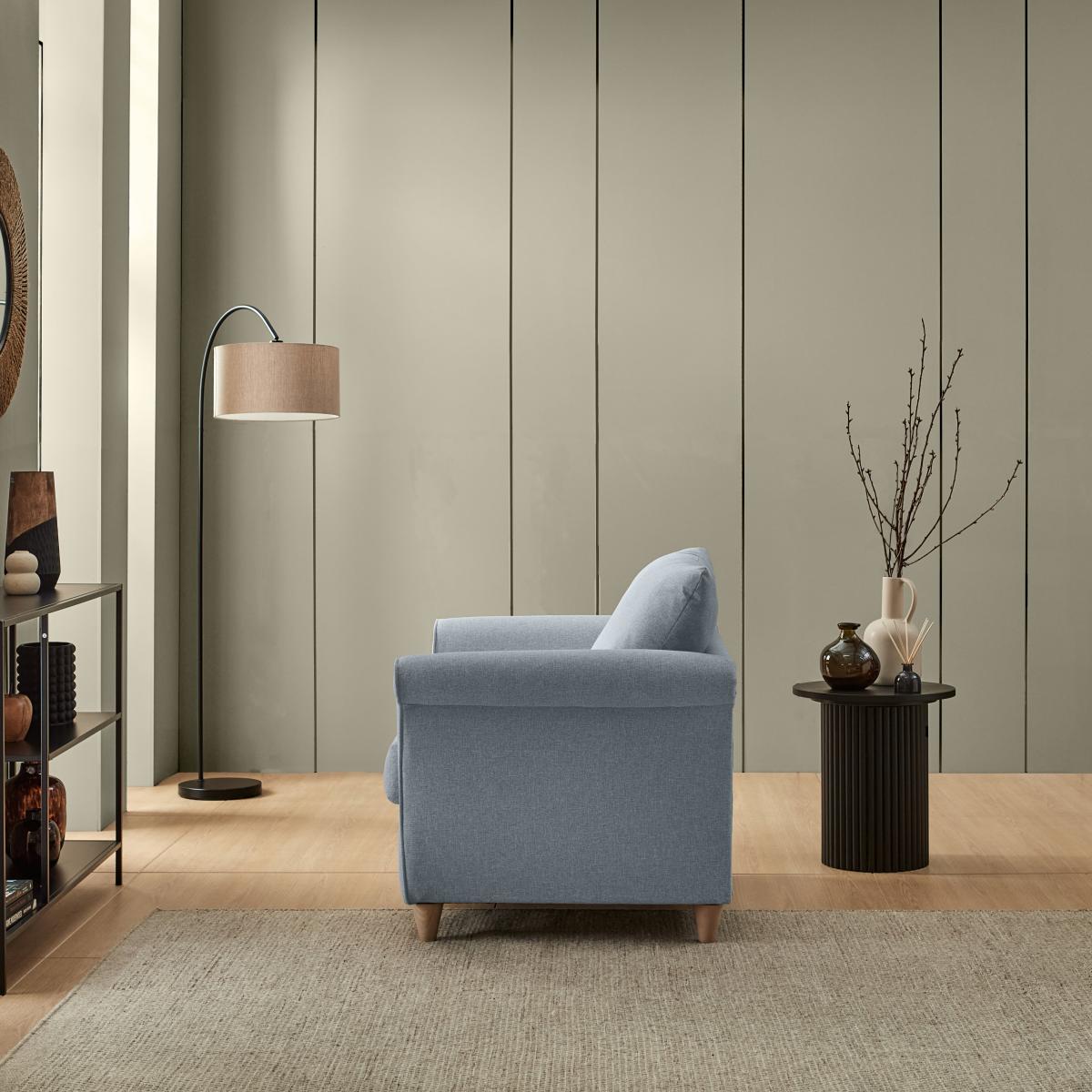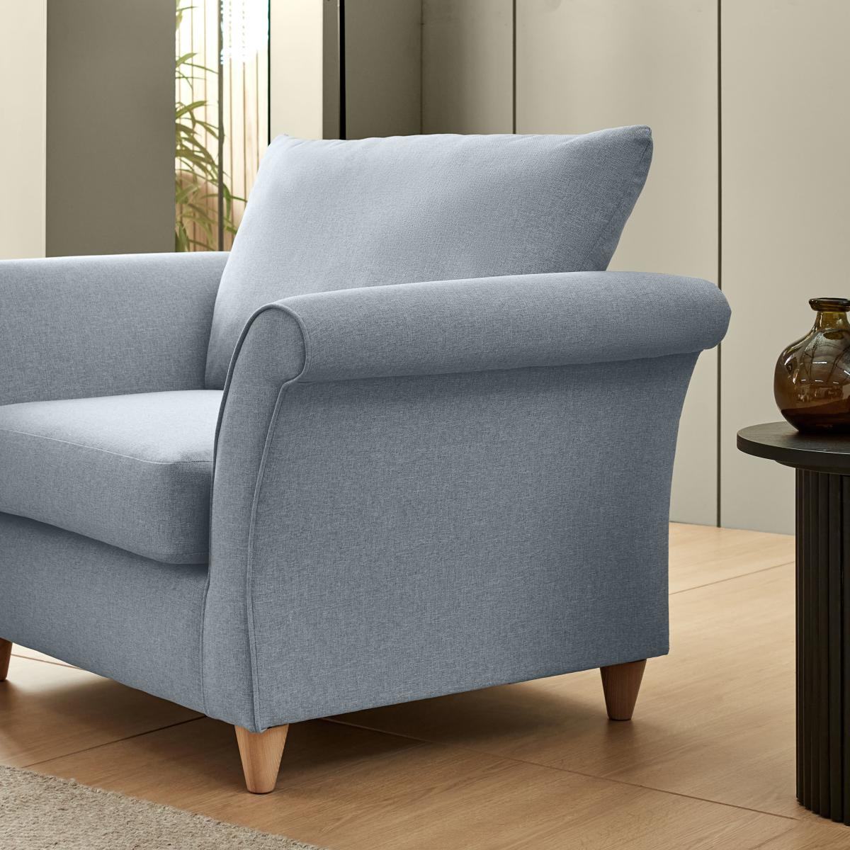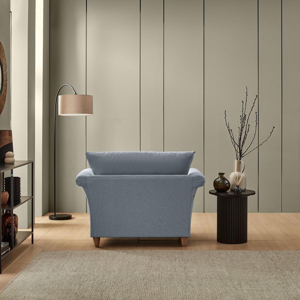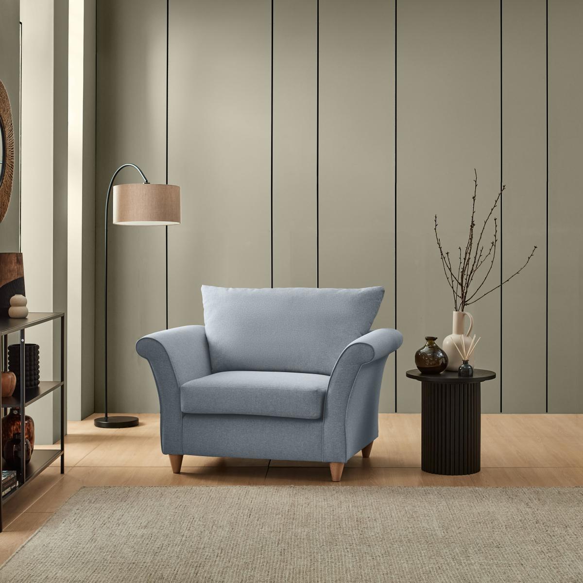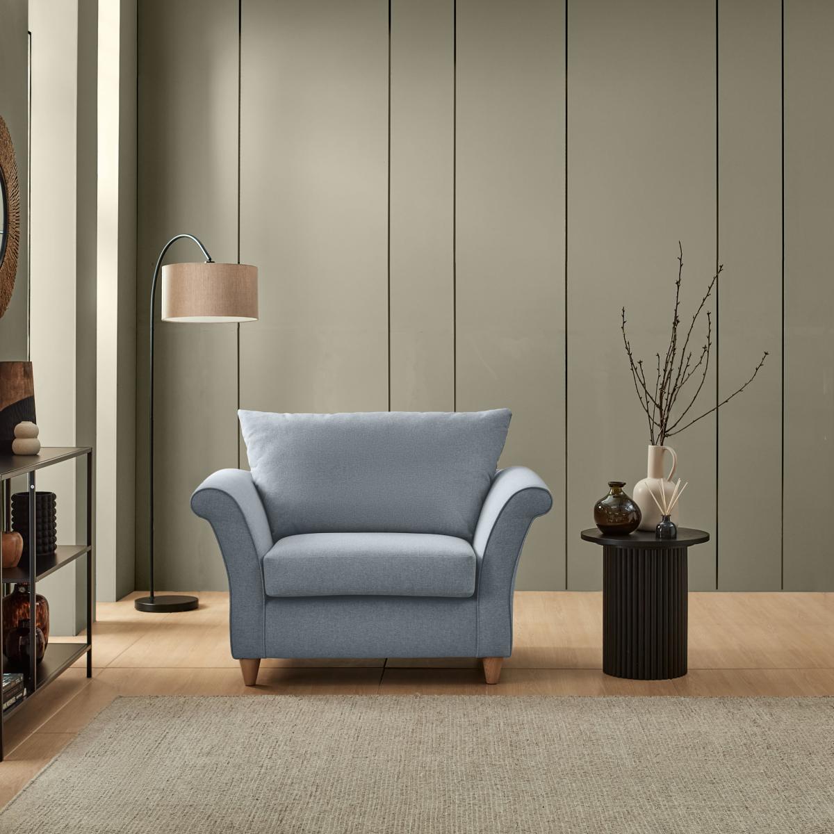 I’m a fan of this denim armchair for its soft, tactile fabric and gently flared arms - it feels both relaxed and refined. It works brilliantly in pared-back contemporary schemes or laid-back farmhouse-style rooms, and its muted blue tone pairs well with warm neutrals or deeper charcoals. For a cosy reading nook, place it beside a slimline floor lamp and a low side table, then layer on a knitted throw and a patterned cushion for contrast. In more minimalist settings, keep accessories to a minimum and let the chair’s subtle texture do the talking.