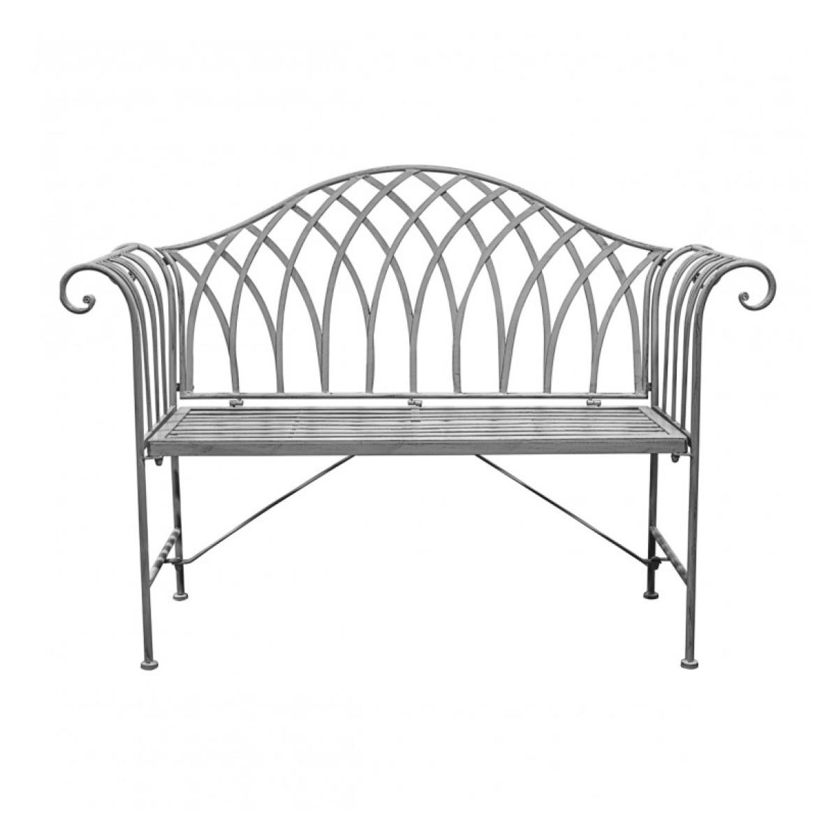 Featuring unique rounded metal arms this stylish metal bench creates a comfortable casual seating area in any outdoor living space, in a distressed, painted grey finish.