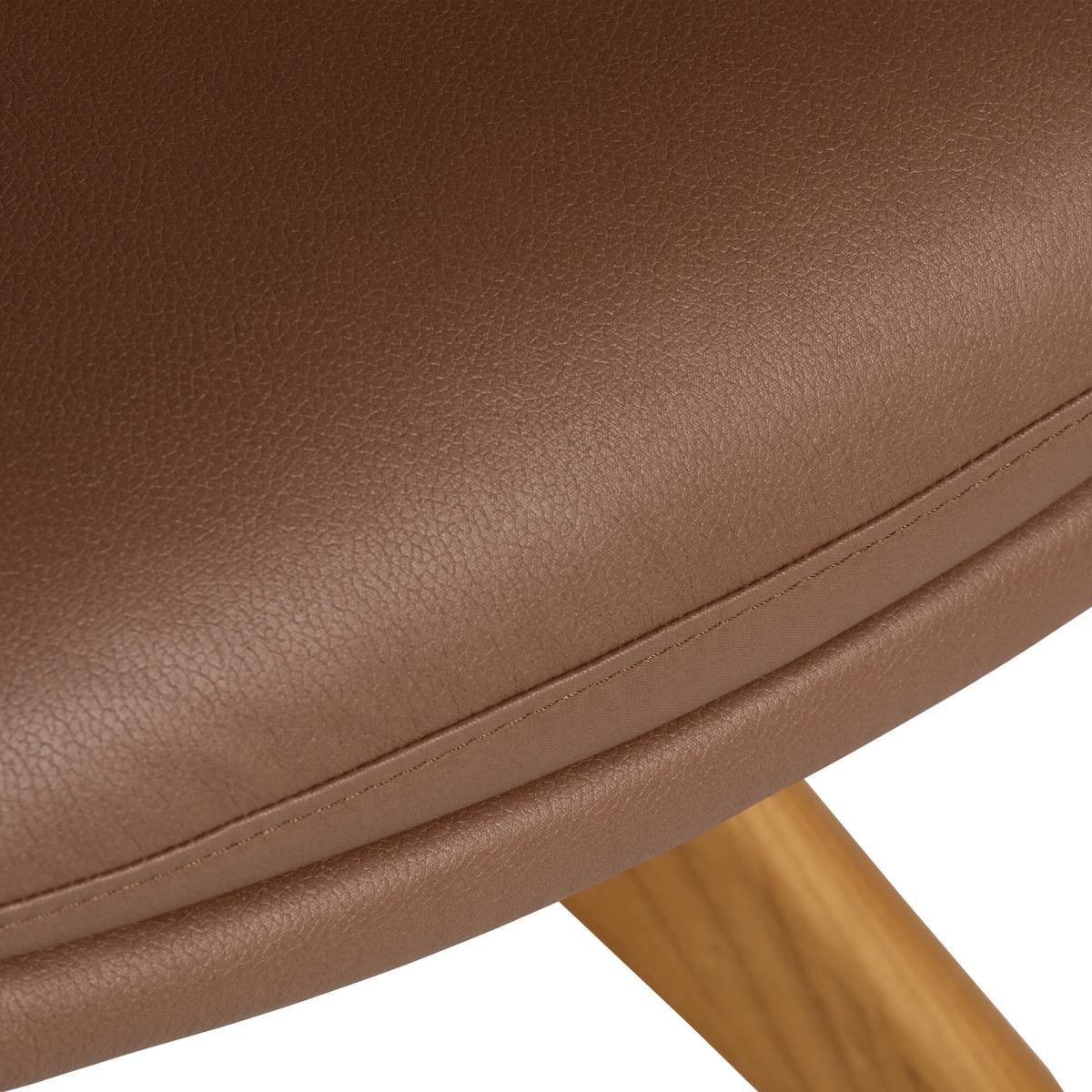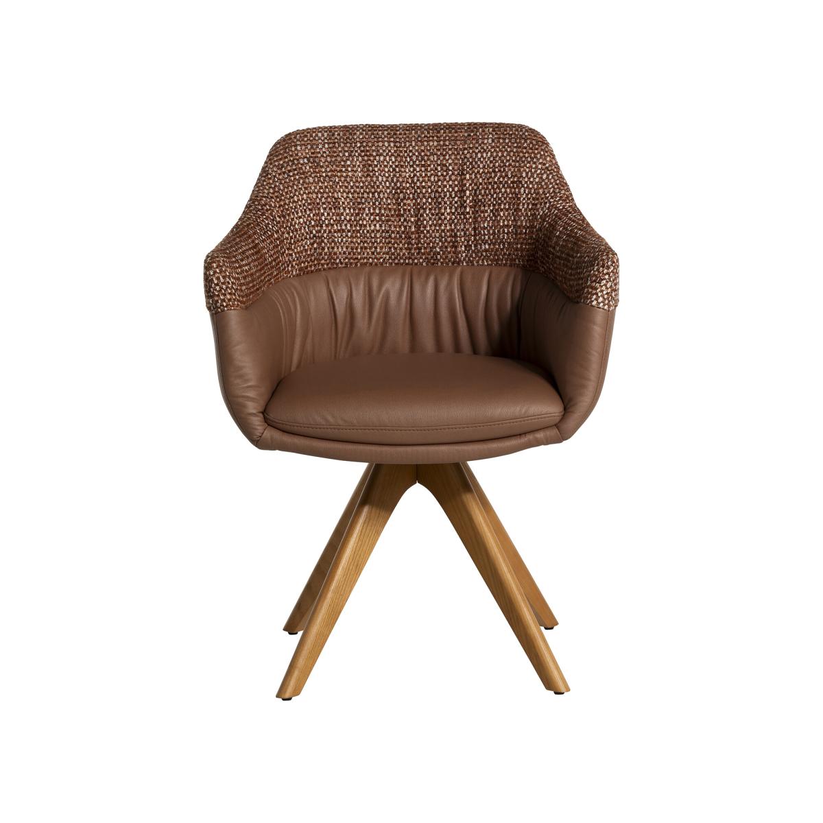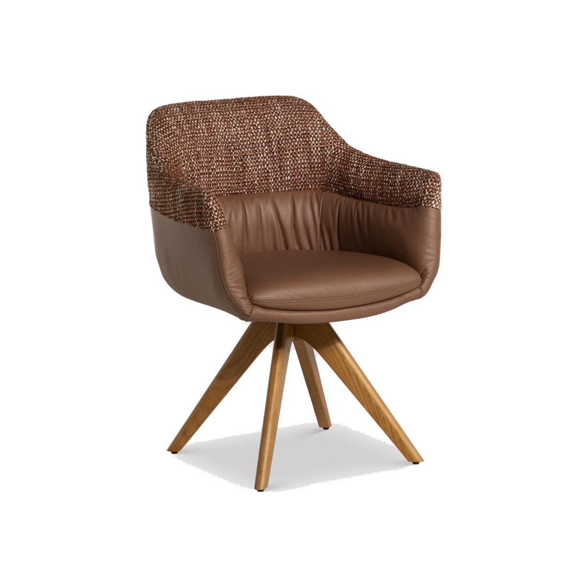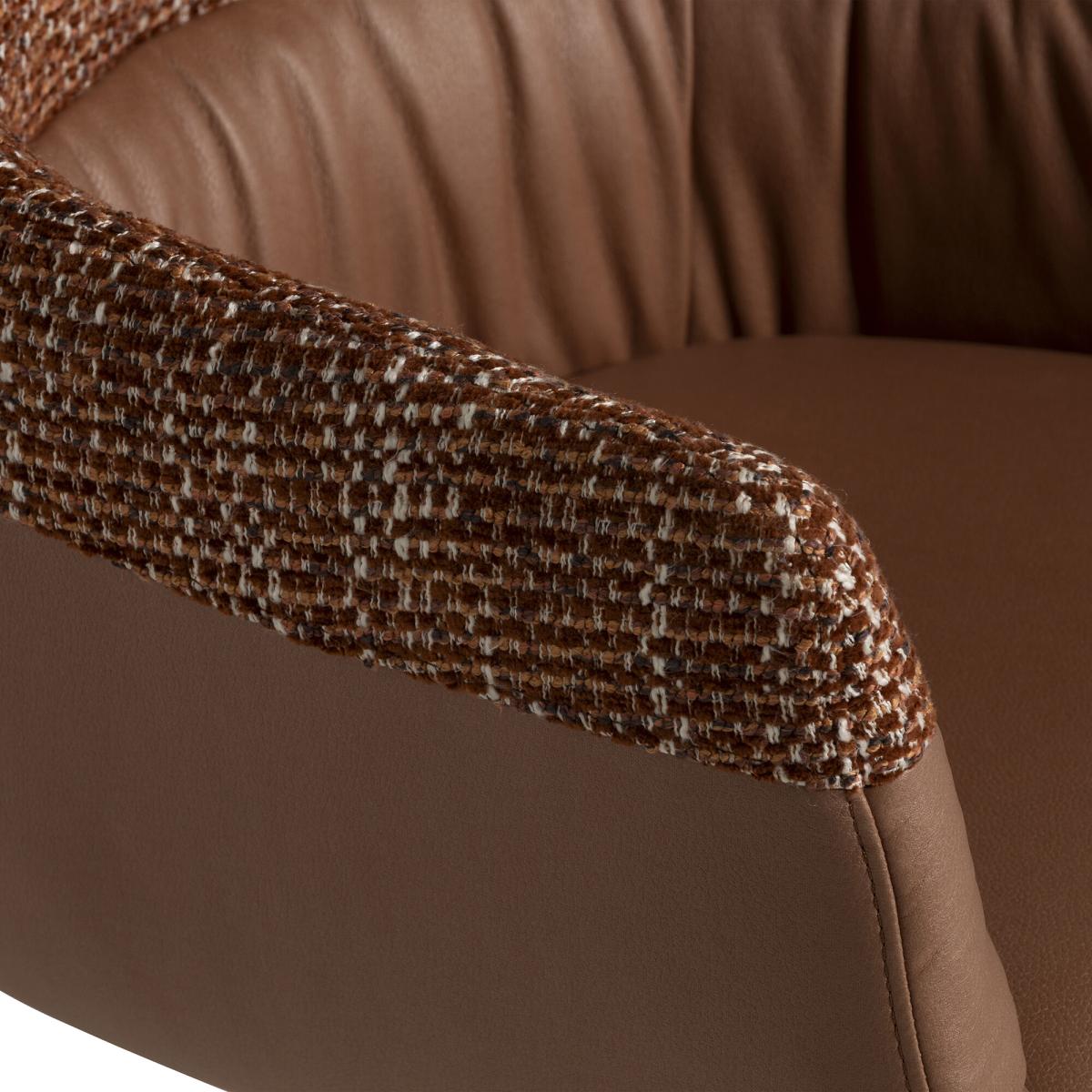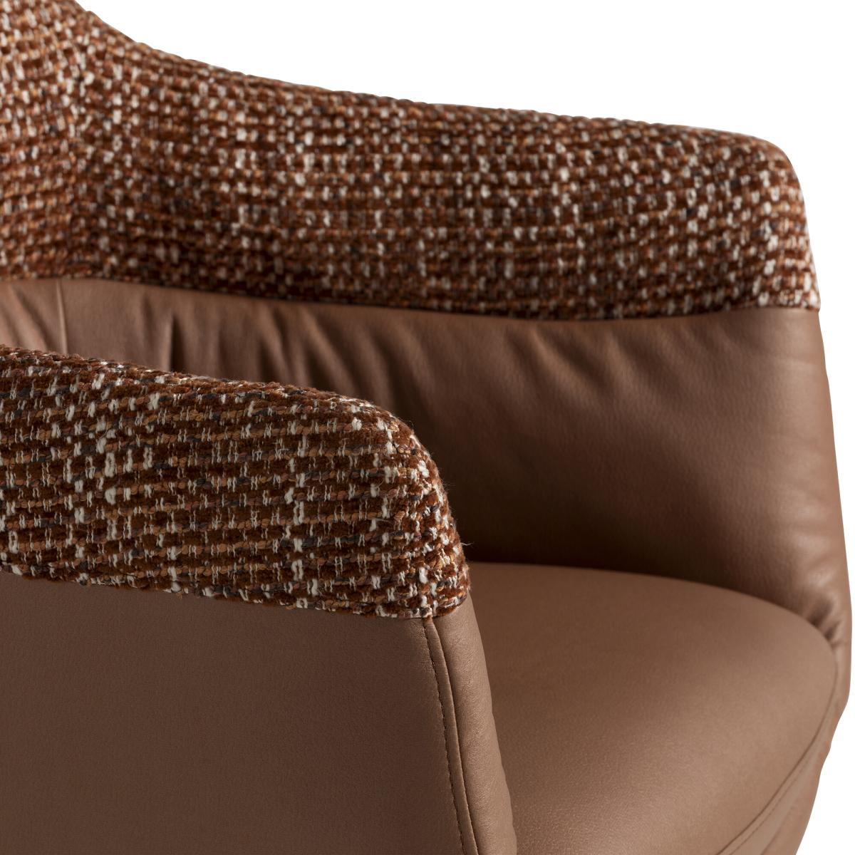 I love this chair for its clever mix of textures and its versatile silhouette. The high armrest design adds a cosy, welcoming feel, making it an ideal accent piece in dining rooms or open plan spaces. The brown fabric and leather combination creates a warm, tactile look that works well in contemporary, Scandinavian, or mid-century interiors. For styling, consider pairing it with a neutral or patterned rug and minimalist table settings to let the chair stand out. It also works beautifully as a standalone feature in a corner with a small side table and a floor lamp, creating a cosy spot for reading or casual chats. Practical tips include layering with cushions for extra comfort or using it as a statement piece in a mix of natural materials for a balanced, inviting look.