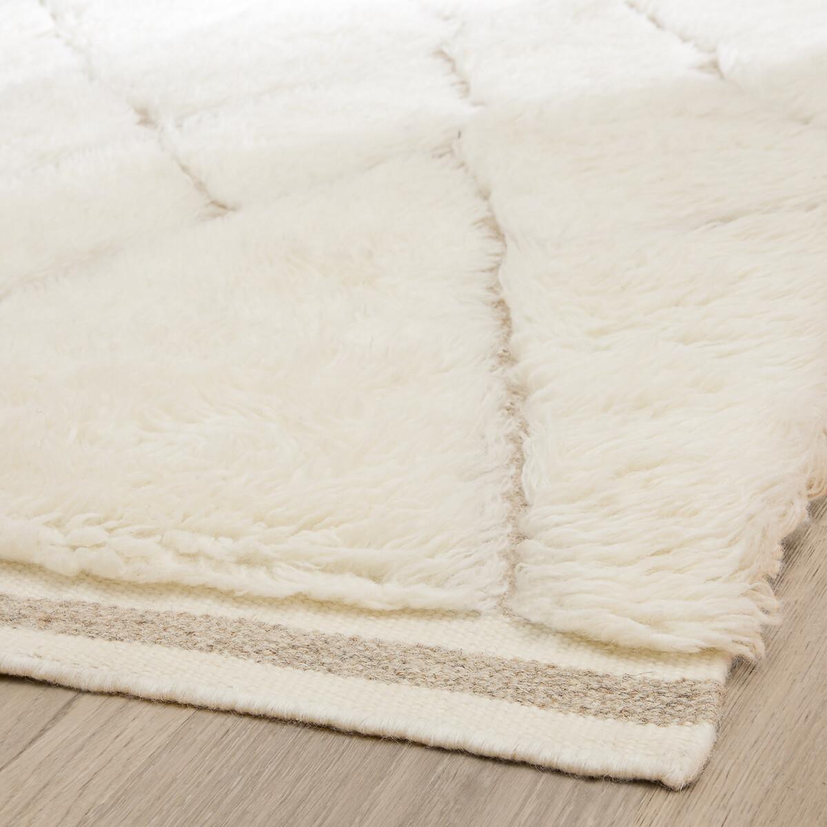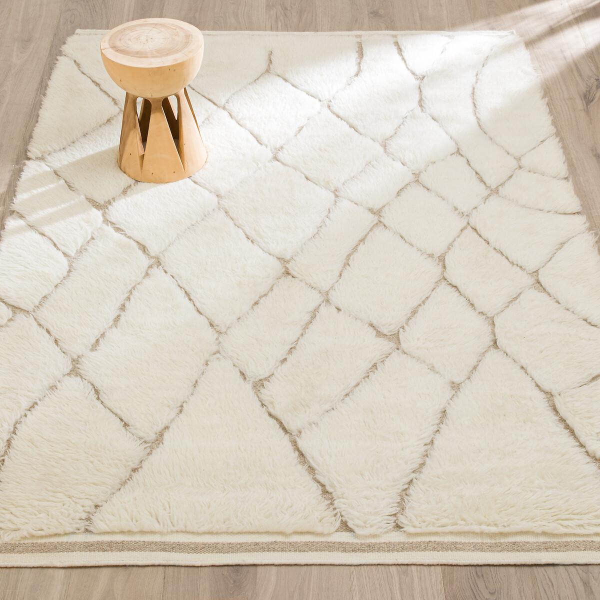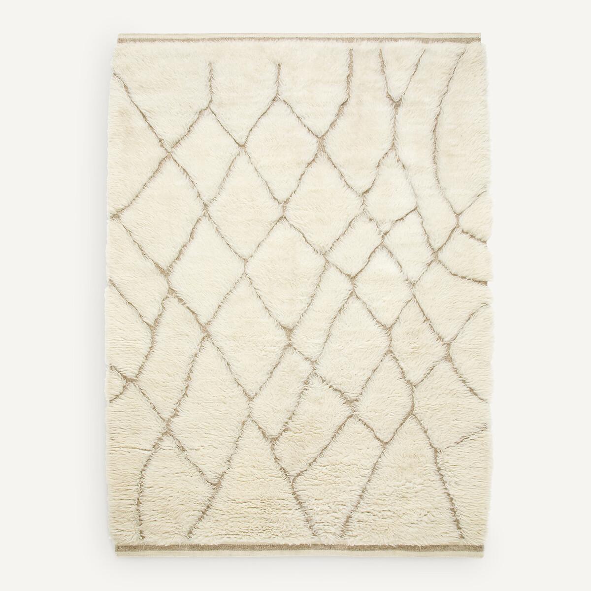 A contemporary take on a traditional design. Berber-inspired, in wool with a soft and warm touch, Djurdi is hand-knotted in India, by local artisans with ancestral know-how.. A marked contrast of high-pile wool, ivory tint, and recessed grey background. Each rug is unique. An AMPM exclusive. Product Details • Pure wool • Craftsmanship: hand-knotted • Weight: 2500g/m2 • Thickness: 35/40mm. Quality Info • Wool is a warm and comfortable fibre. A wool rug is also an excellent thermal and sound insulator. Care Advice • Some materials such as wool are very fibrous and you can actually observe a piling during the first weeks of use: this is a normal for this type of product and is not a defect. Remove the excess fibres by hand where possible, do not use a vacuum cleaner with a rotating brush as this can pull and tear the fibres. The pilling will improve over time. • We advise you to vacuum it very little the first month and then to vacuum it without rubbing too much always without using the brush. • Remove any stains immediately with a clean, damp cloth. • Dry clean recommended. Sizes • Width 120 x Length 180cm • Width 160 x Length 230cm • Width 200 x Length 290cmDelivery:. This product will be delivered directly to your door. Dimensions and weight of parcel Size 120 x 180cm • 1 parcel • L123 x H16 x D16cm, 6.4kg. Size 160 x 230cm • 1 parcel • L163 x H18 x D18cm, 10.5kg. Size 200 x 290cm • 1 parcel • L203 x H20 x D20cm, 16.1kg