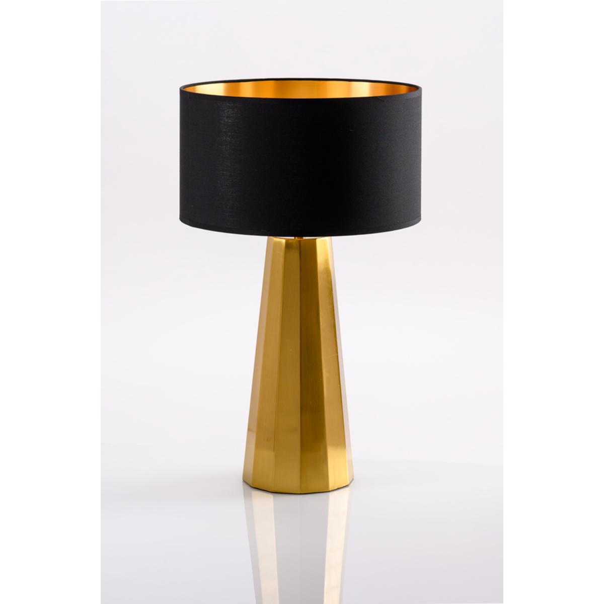 A bold, statement table light Geometric shaped base in stainless steel with a brushed brass finish Polycotton shade in black with a metallic reflective inner Supplied with a G50 E27 non dimmable bulb