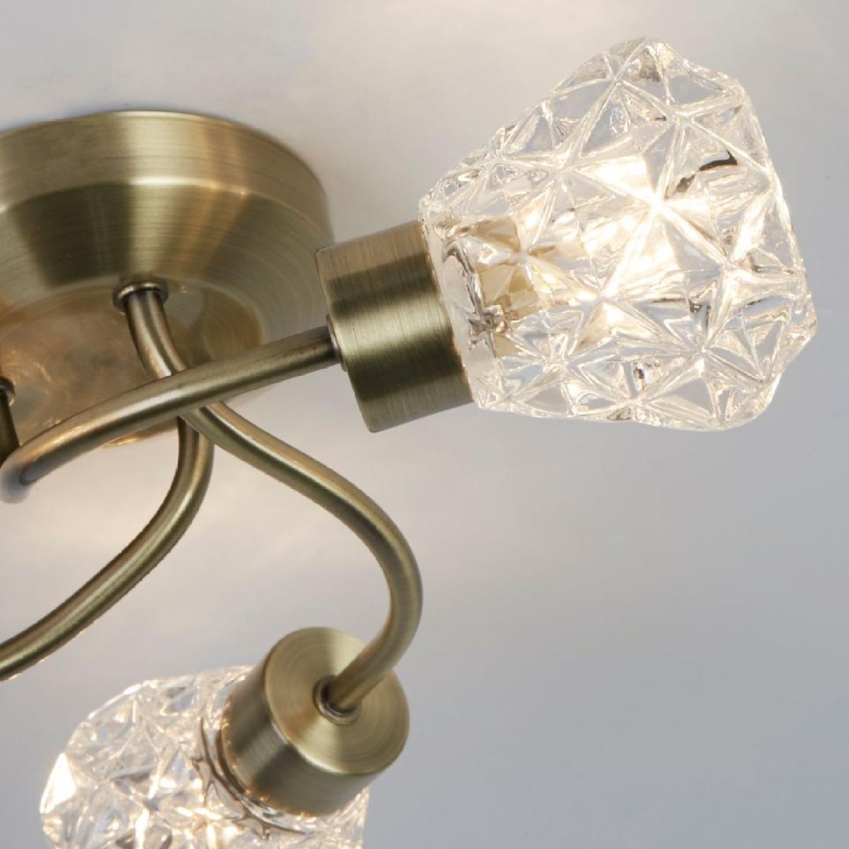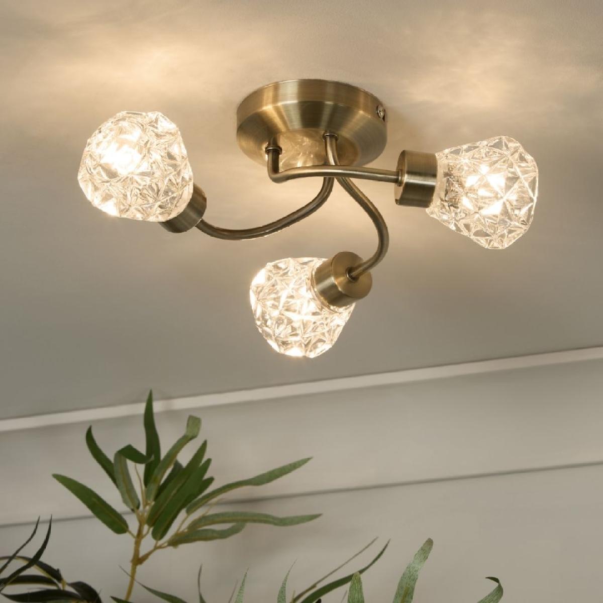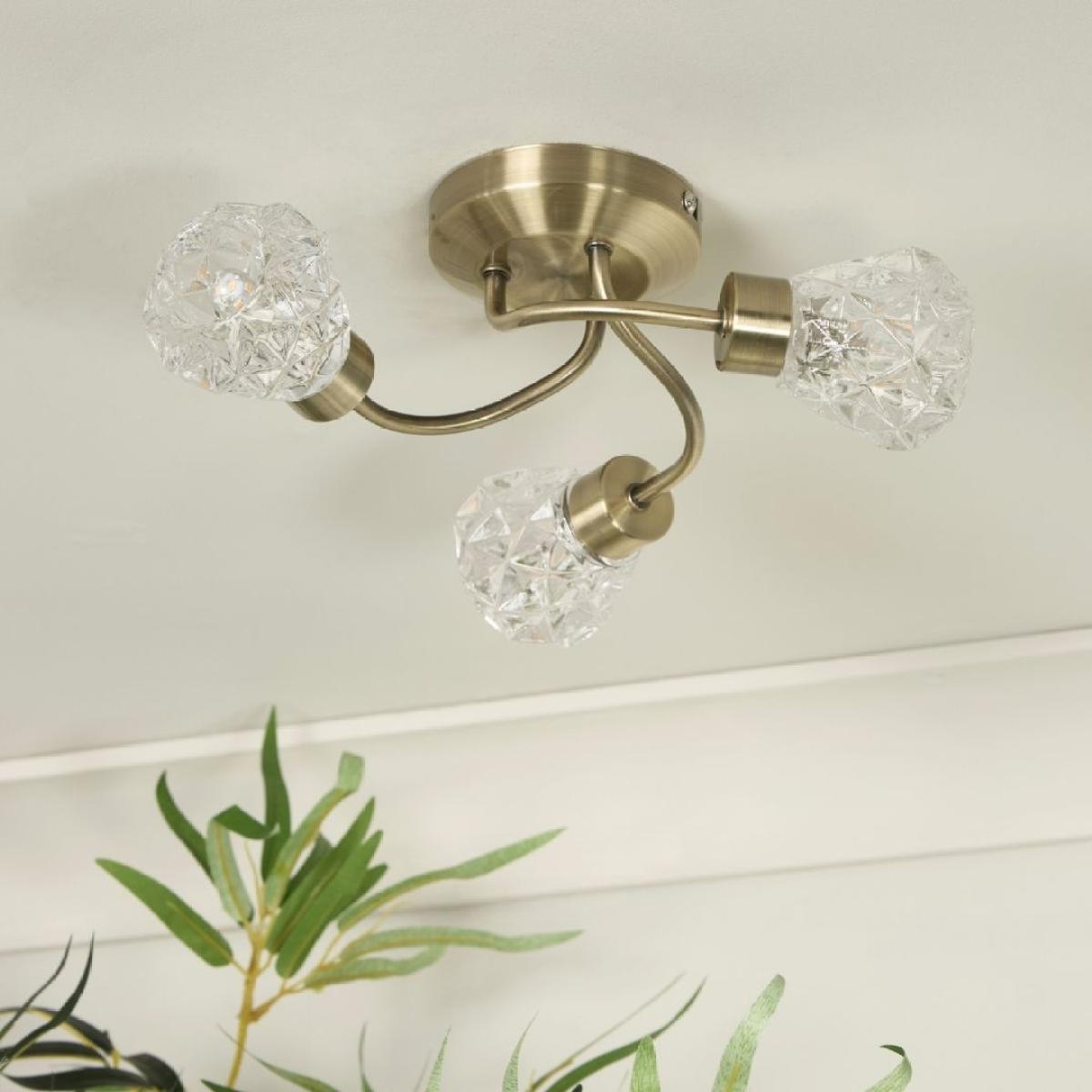 Dodo 3-light flush ceiling light, featuring a twisted design, faceted glass shades and an antique brass finish. A sophisticated fixture that combines classic charm with contemporary flair, this elegant light features a twisted design that adds dynamic movement to your ceiling, while the faceted glass shades beautifully diffuse light, casting a warm and inviting glow. The antique brass finish enhances its timeless appeal, making it a perfect addition to both traditional and modern interiors. Ideal for living rooms, bedrooms or dining areas, the Dodo ceiling light offers a stylish yet functional lighting solution. Its intricate design ensures that it stands out as a statement piece, adding a touch of luxury and refinement to your home. Dodo 3-light flush ceiling light, featuring a twisted design, faceted glass shades and an antique brass finish. A sophisticated fixture that combines classic charm with contemporary flair, this elegant light features a twisted design that adds dynamic movement to your ceiling, while the faceted glass shades beautifully diffuse light, casting a warm and inviting glow. The antique brass finish enhances its timeless appeal, making it a perfect addition to both traditional and modern interiors. Ideal for living rooms, bedrooms or dining areas, the Dodo ceiling light offers a stylish yet functional lighting solution. Its intricate design ensures that it stands out as a statement piece, adding a touch of luxury and refinement to your home.