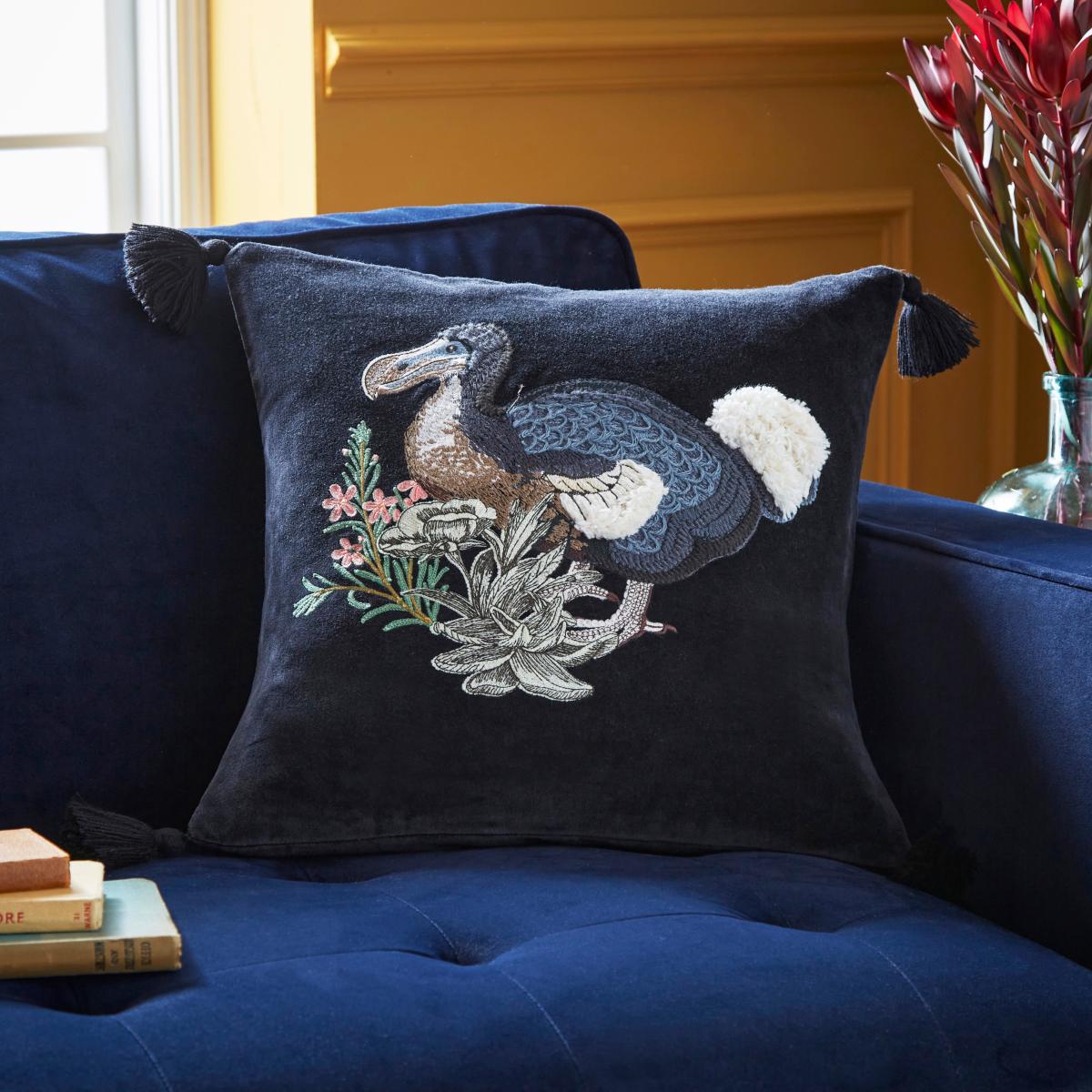 This Dodo embroidered cushion cover offers a sleek and sophisticated touch, making it a versatile addition to both contemporary and traditional interiors. I love how the black fabric provides a chic and timeless backdrop, highlighting the intricate embroidery of the dodo. It works particularly well in monochrome or accent colour schemes, adding texture and interest without overpowering the space. For styling, consider pairing it with other velvet or textured cushions in complementary tones to create a layered, inviting look. Its dark hue also makes it practical, as it can help conceal minor stains or marks, making it ideal for regular use on sofas or armchairs.