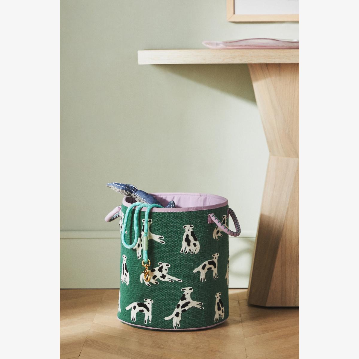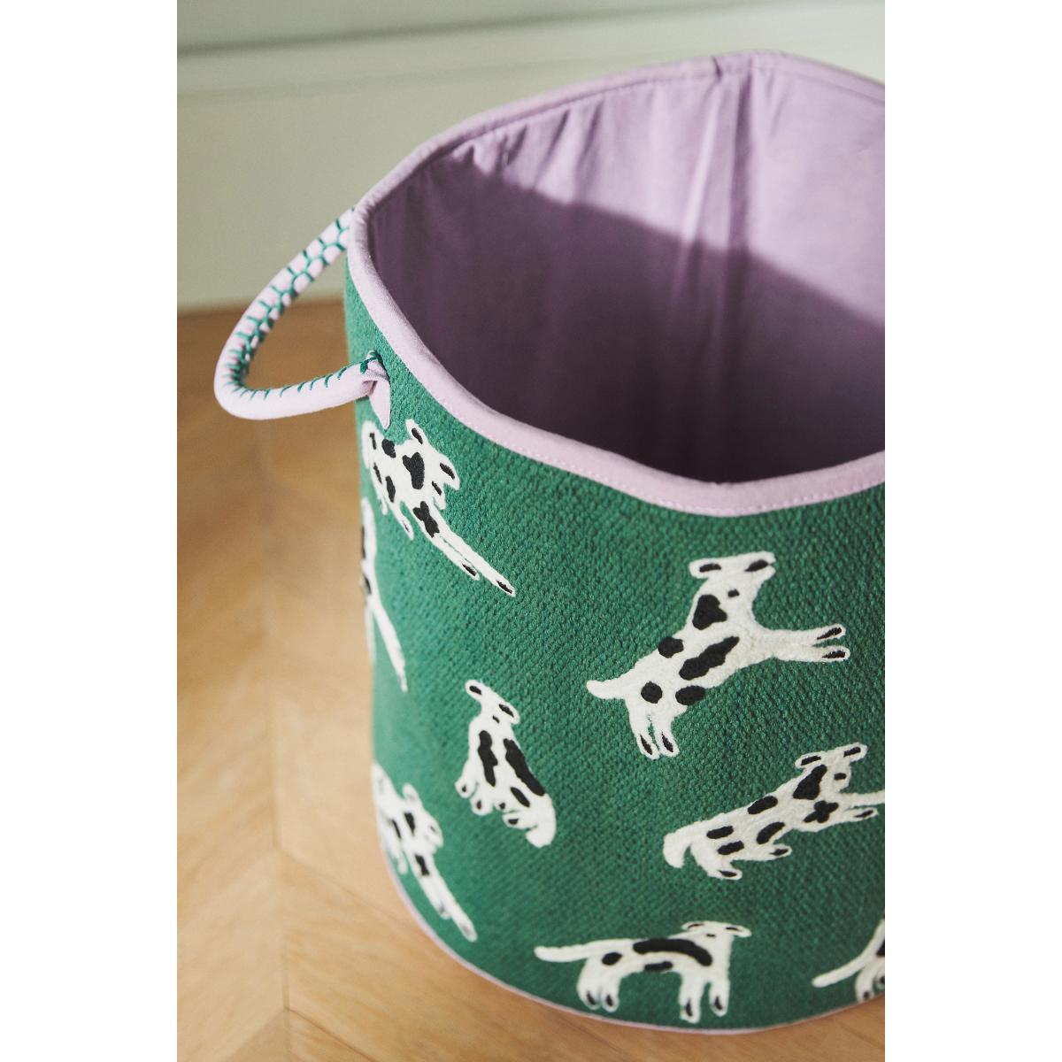 Decorated with embroidered dalmatian motifs, this cotton basket is perfect for storing dog toys and treats, or filling with teddies and books in your little one's play den. * 100% Cotton dhurrie with embroidery; Canvas lining * Please note, due to the crafted nature of this item some variation may occur * Two top handles * Spot clean * Imported