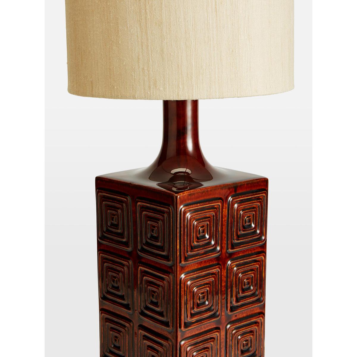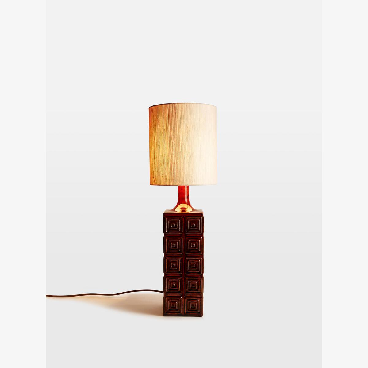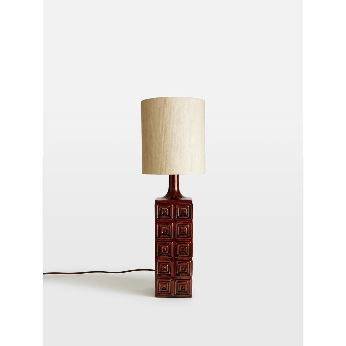 The Dohara table lamp features a ceramic base with embossed geometric squares as a nod to mid-century styles. Spotted in White City House, the lamp is finished with a reactive glaze and a raw silk linen shade which has been woven from natural, untreated yarns for a coarse texture and elegant sheen. Perch it on a console table, or keep it bedside to create an ambience for late-night reading. Mid-century style Raw silk linen shade woven from untreated yarns Tone-tone colour effect base Embossed geometric squares Reactive glazed base Inspired by White City House