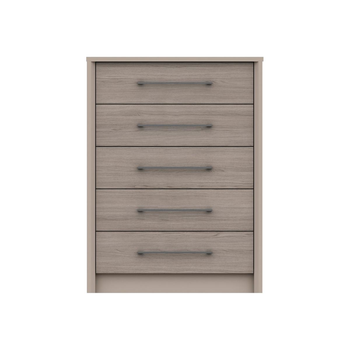Crafted with a coloured carcass with complementing oak effect drawer fronts, the Dolan 5 Chest of Drawers would make a stylish addition to any bedroom. This modern chest of drawers features five spacious drawers complete with stylish brushed pewter finished slim handles, linen-look drawer insides, 8mm heavy duty bases and easy glide runners for ease of use. Please note, unfortunately we cannot deliver this item to the Channel Islands, Ireland, Isle of White, Isle of Man or the Scottish Islands. Please note, this item cannot be delivered to Jersey.