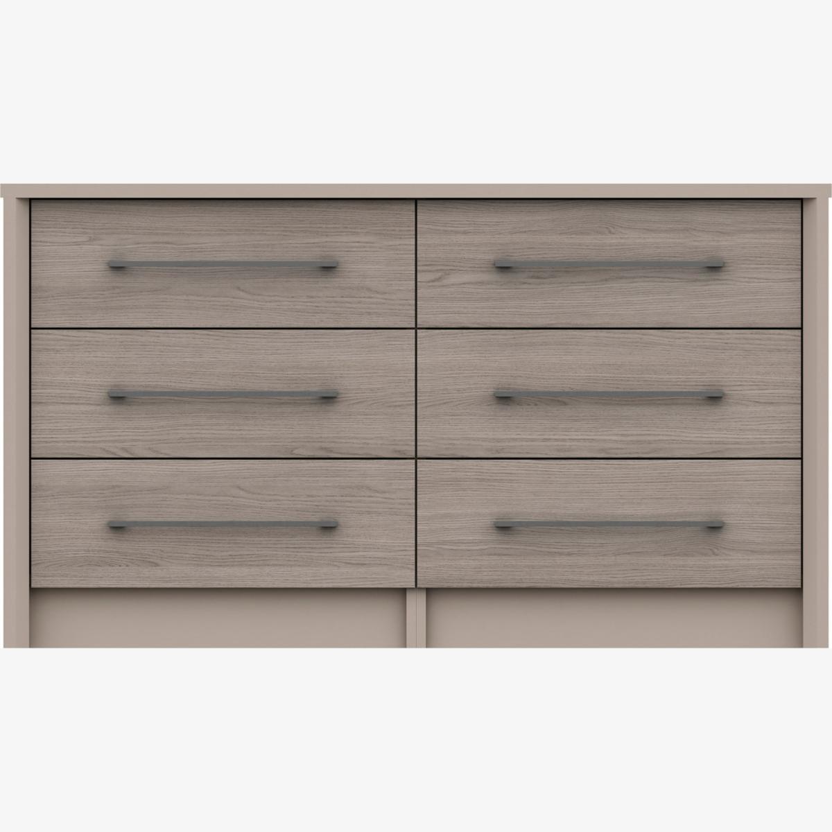Crafted with a coloured carcass with complementing oak effect drawer fronts, the Dolan 6 Chest of Drawers would make a stylish addition to any bedroom. This modern chest of drawers features five spacious drawers complete with stylish brushed pewter finished slim handles, linen-look drawer insides, 8mm heavy duty bases and easy glide runners for ease of use. Please note, unfortunately we can not deliver this item to the Channel Islands, Ireland, Isle of White, Isle of Man or the Scottish Islands. Please note, this item cannot be delivered to Jersey.