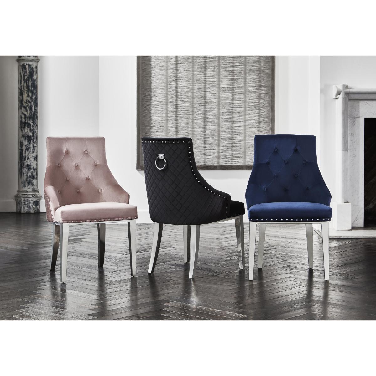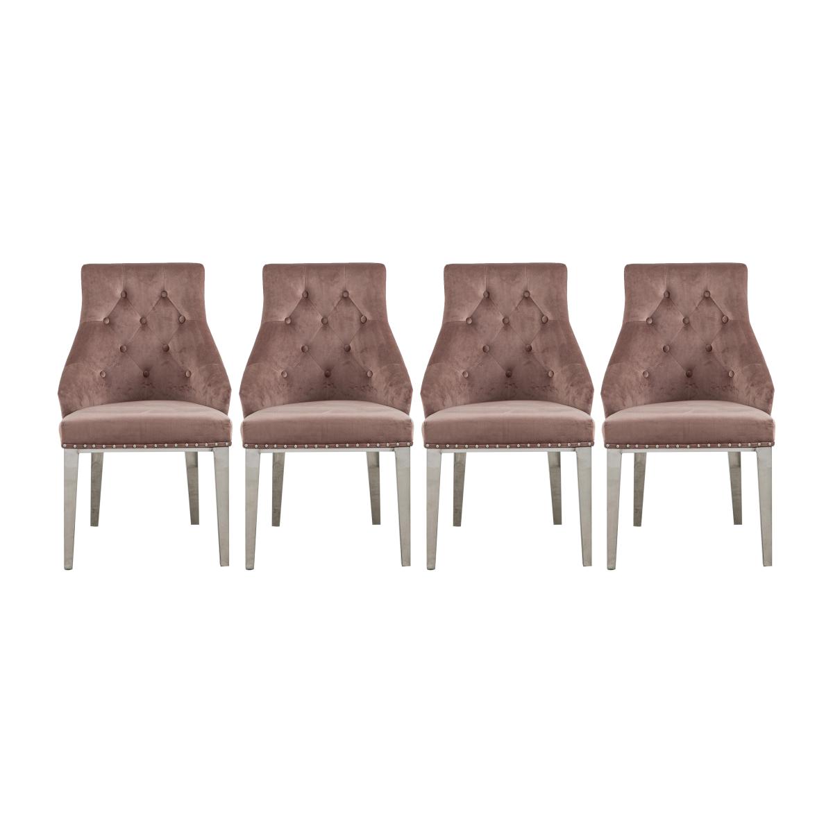 Live life in luxury with the Dolce collection of living and dining furniture – the perfect look for your glamorous home. Pieces are made from marble with perfectly patterned light grey marbled tops. Bases sparkle with a chrome finish, a luxe look that you’ll also find on the collection’s dining chair legs and deep table edges. Grand in scale, the range includes a large dining table that seats eight, a round table seating six, a sideboard and occasional tables as well as two styles of opulent dining chair and several dining sets. The Dolce collection is exclusively available at Furniture Village. Dining chairs seldom get more glam than the Dolce button back dining chair. With gorgeous curves and a wealth of luxe details, this set of four dining chairs will transform your dining room. Why you'll love it Beautifully tailored set of 4 button back dining chairs. Glam style. Gracefully curved, back-supporting design. Bright chrome-effect legs, metallic studding and seat-back handles. Upholstered in velvet with quilted-effect stitching. In a choice of colours. Exclusive to Furniture Village. This set of 4 button back dining chairs is part of the Dolce range. What you need to know Foam seat cushioning. Metal frame and base. The flattening and shading of pile fabrics like velvet is unavoidable. Pile fabrics may be vacuumed lightly using the curtain attachment. Brush regularly in the direction of the pile with a soft brush. Also available in a set of 6 and as part of a Dolce dining set.