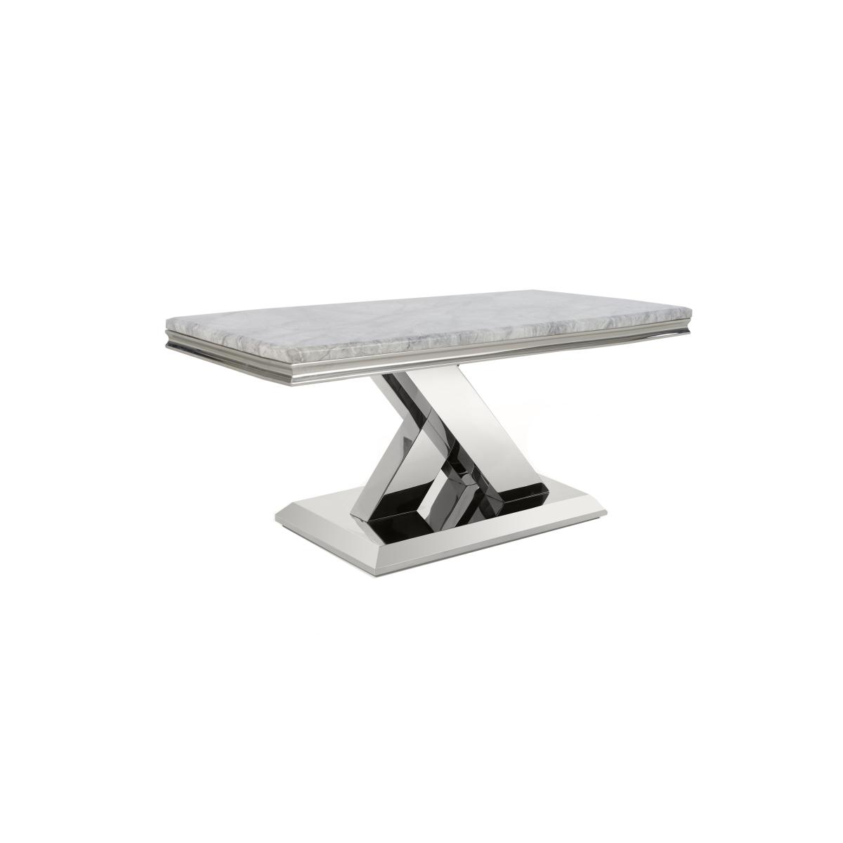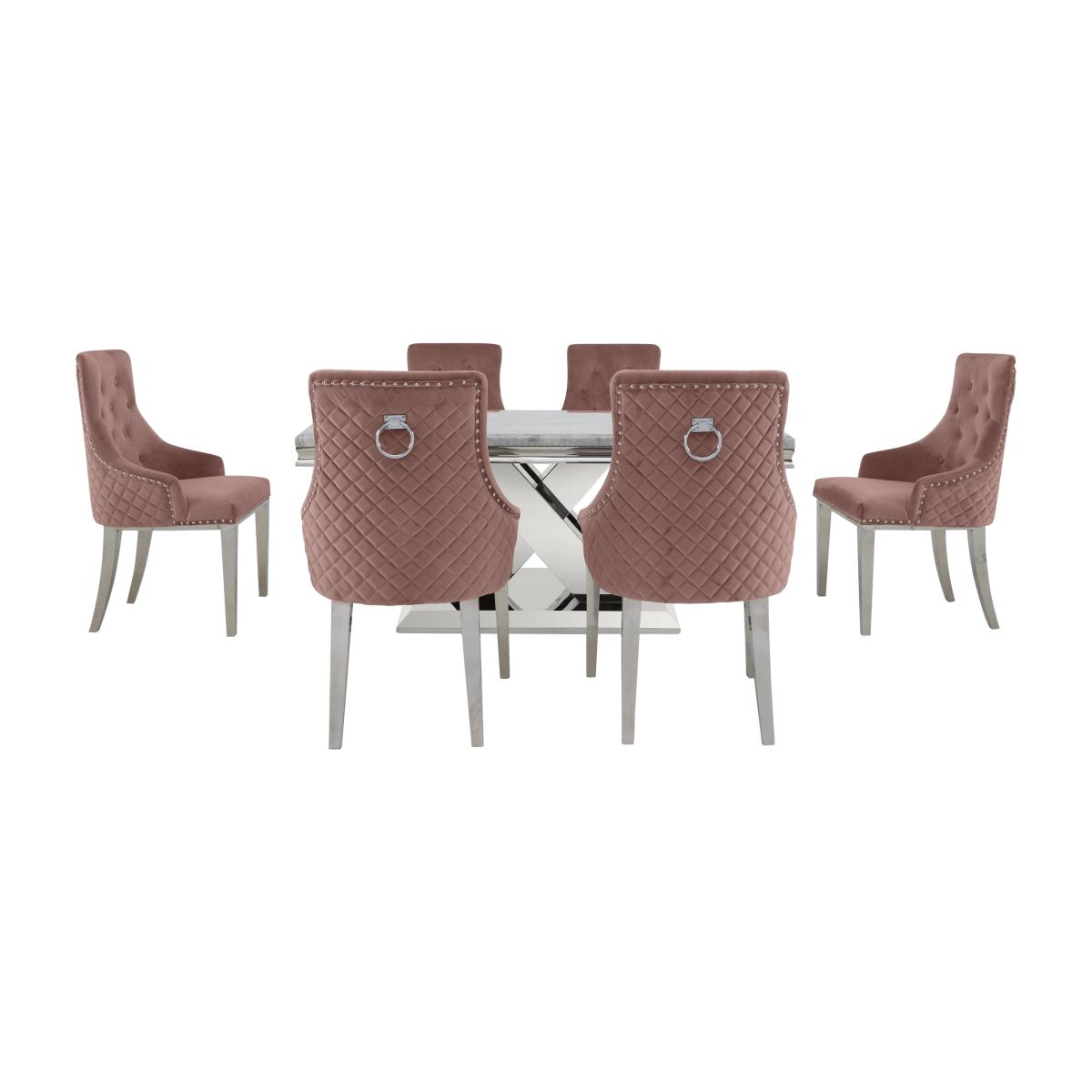 Live life in luxury with the Dolce collection of living and dining furniture – the perfect look for your glamorous home. Pieces are made from solid marble with perfectly patterned light grey marbled tops. Bases sparkle with a chrome finish, a luxe look that you’ll also find on the collection’s dining chair legs and deep table edges. Grand in scale, the range includes a large dining table that seats eight, a round table seating six, a sideboard and occasional tables as well as two styles of opulent dining chair and several dining sets. The Dolce collection is exclusively available at Furniture Village. Dining at home has never been more glamorous thanks to the small Dolce dining table and six button back chairs. A beautiful table made from real marble and six comfy chairs that add sparkle and shine with their chrome-effect studding. Why you'll love it. Fabulous dining set sparkles in polished marble and chrome. Glamorous style for luxurious living. Solid marble dining table has a beautiful light grey marbled finish. A special process ensures that the marbled surface is perfectly patterned. Chrome-finished table top trim and X-shaped pedestal base. Six dining chairs upholstered in black, blush, silver and navy. Button backs, chrome-effect metallic studding and quilted-effect stitching. Chrome-finished legs and handle on outer back. Exclusive to Furniture Village. What you need to know. Dining table is made with real marble. Seats up to 6. Use care to avoid scratching or marking the foil finish. Extremely heavy – please be careful when moving. Velvet may crush or show shading with use. This is normal and not a defect. Complete the look with the statement marble Dolce sideboard.