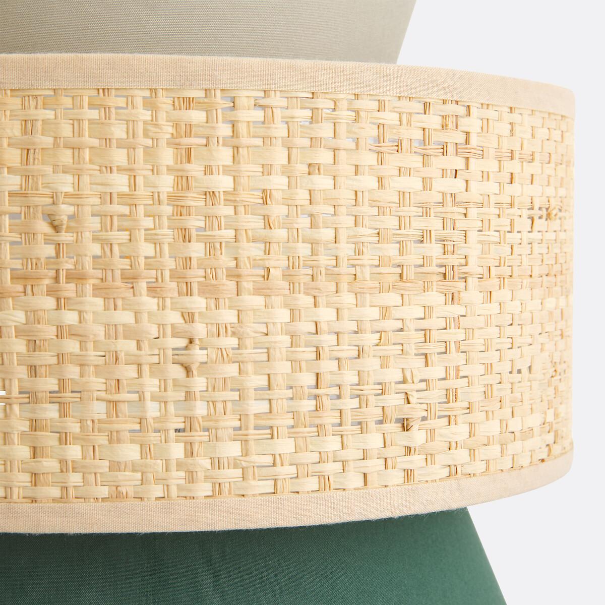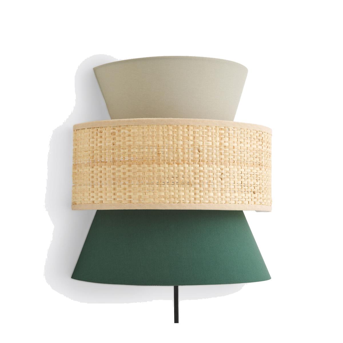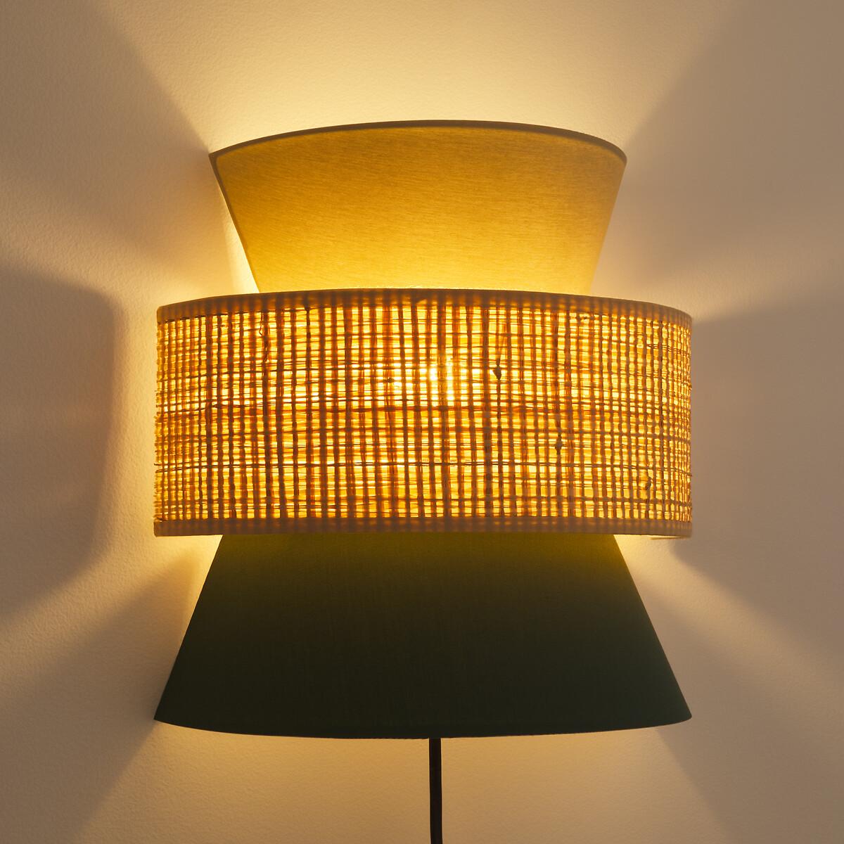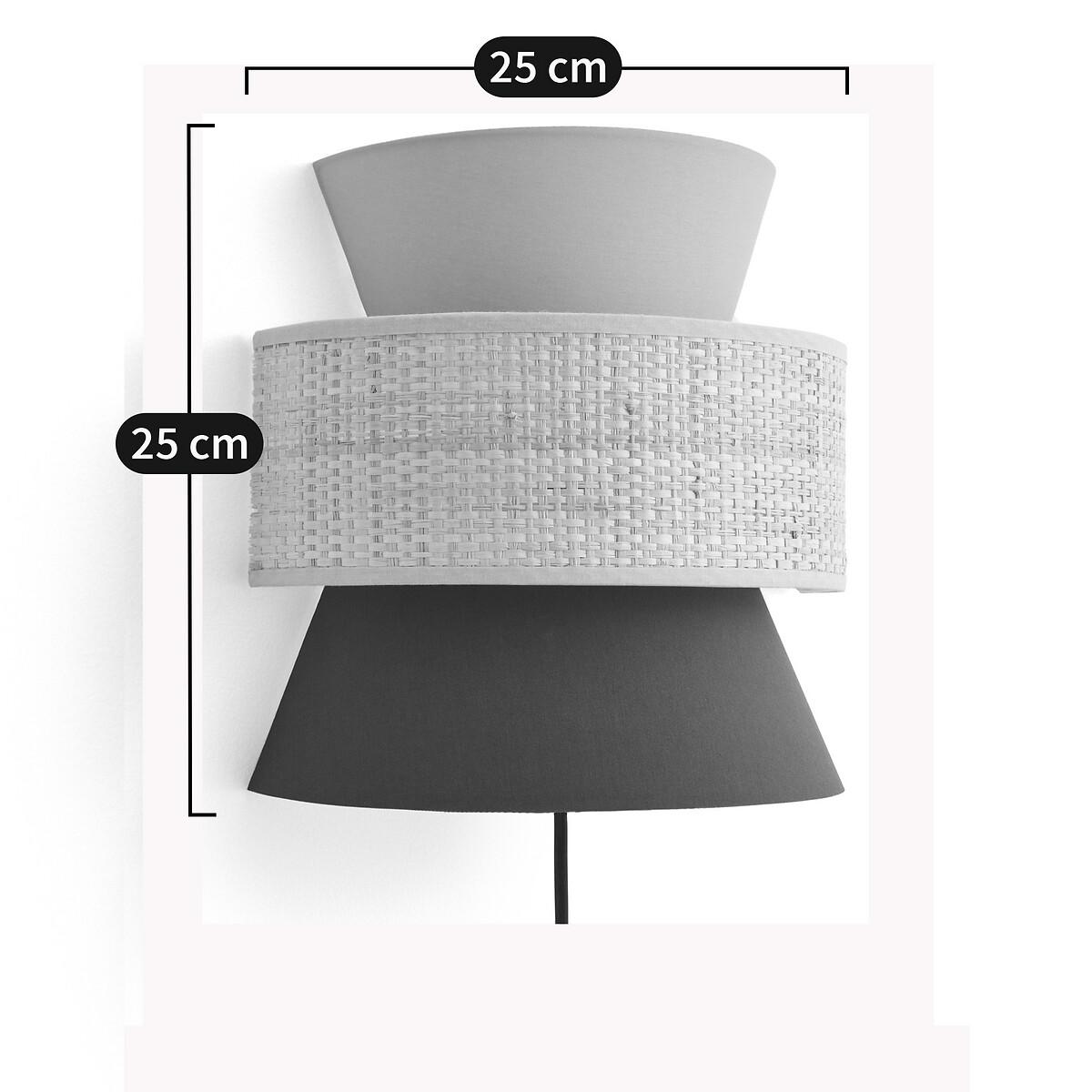 Surrounded by a ring made of polycotton and raffia, it gives you a very on-trend vintage style. Made in France. Product Details • Galvanised steel structure covered with epoxy paint • Shade consisting of 3 tiers: 2 conical shaped in polycotton, 1 central cylindrical shaped in raffia • Plate with E14 socket support (screws and plugs not supplied) • Note : Electrical system sold separately. Find it by typing 'Baulind cable' into the search box on our site. Dimensions • Length: 25cm • Height: 25cm • Depth: 13cm • Made in France. Dimensions and weight of parcel1 parcel • 26 x 26 x 16cm • 0.5kg