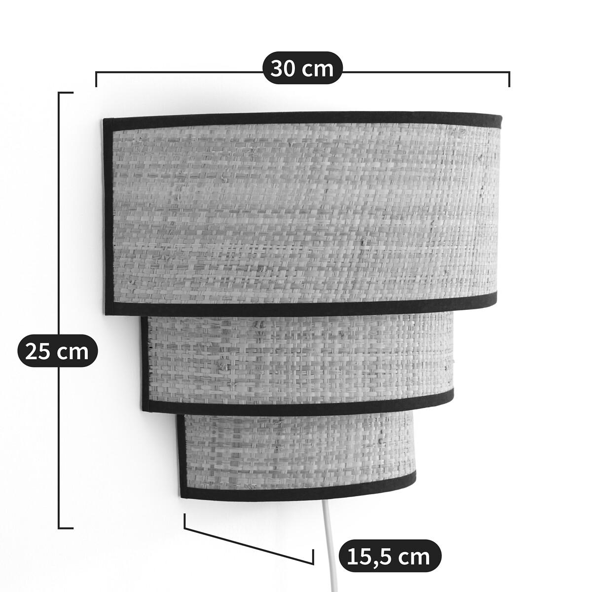 Bring in the light. The Dolkie raffia wall lamp is ideal for bringing a natural note to a contemporary interior. It helps to create a soft and warm atmosphere. Made in France. Product Details • Triple raffia lampshade, with cotton braid • Galvanised steel structure covered with epoxy paint • Support for E14 socket (bulb not included) • This product is sold non-electrified, Baulind electric cable sold on our site. Dimensions • Length: 30cm • Height: 25cm • Depth: 15.5cm • Made in France. Parcel Dimensions1 parcel • L31 x H22 x D31cm. 0.3kg.