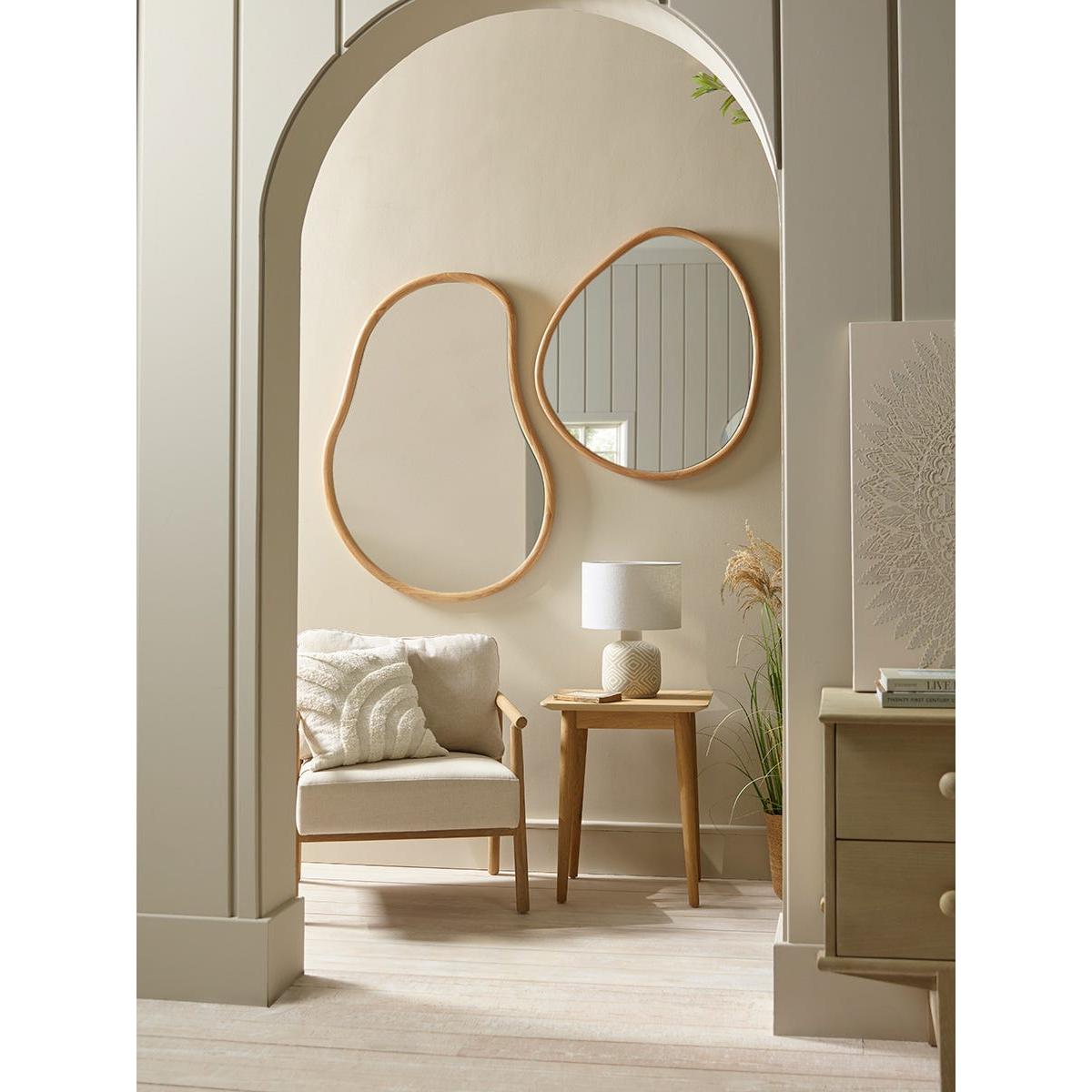 I love this mirror because of its organic, freeform shape, which adds a touch of modernity and softness to a space. It works particularly well in minimal or Scandinavian-inspired interiors, where it can serve as a statement piece that keeps things light and airy. Practical styling tips include placing it above a console or sideboard to reflect light and make the room feel larger, or hanging it in a bedroom to create a cosy, inviting feel. The wooden frame gives it versatility to pair with natural materials, while its unique shape adds visual interest without overpowering the surroundings.