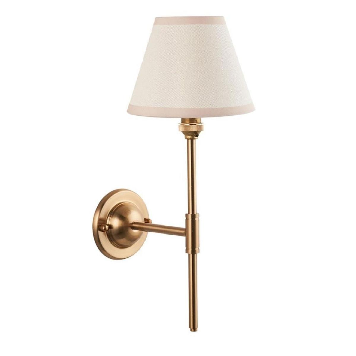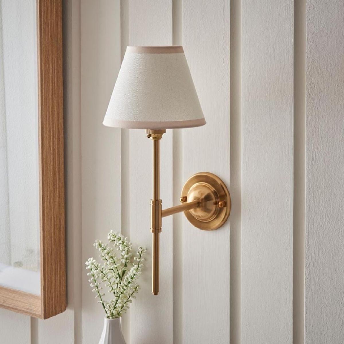Dome 1-light wall light, featuring a brushed aged brass finish and paired with a handcrafted, vintage white 16cm tapered shade with almond white contrasting taped edge detail. The Dome wall light is a beautifully crafted lighting piece that blends classic elegance with understated sophistication. Featuring a brushed aged brass finish, it exudes timeless charm, while the handcrafted vintage white tapered shade is finished with an almond white contrasting taped edge for a refined touch. Designed with both style and functionality in mind, this wall light features a dome-shaped backplate and an elegantly linear arm, which can be adjusted to achieve the perfect lighting angle. Ideal for hallways, living rooms or bedside placement, it provides a warm and inviting glow, complementing both traditional and contemporary interiors. Dome 1-light wall light, featuring a brushed aged brass finish and paired with a handcrafted, vintage white 16cm tapered shade with almond white contrasting taped edge detail. The Dome wall light is a beautifully crafted lighting piece that blends classic elegance with understated sophistication. Featuring a brushed aged brass finish, it exudes timeless charm, while the handcrafted vintage white tapered shade is finished with an almond white contrasting taped edge for a refined touch. Designed with both style and functionality in mind, this wall light features a dome-shaped backplate and an elegantly linear arm, which can be adjusted to achieve the perfect lighting angle. Ideal for hallways, living rooms or bedside placement, it provides a warm and inviting glow, complementing both traditional and contemporary interiors.
