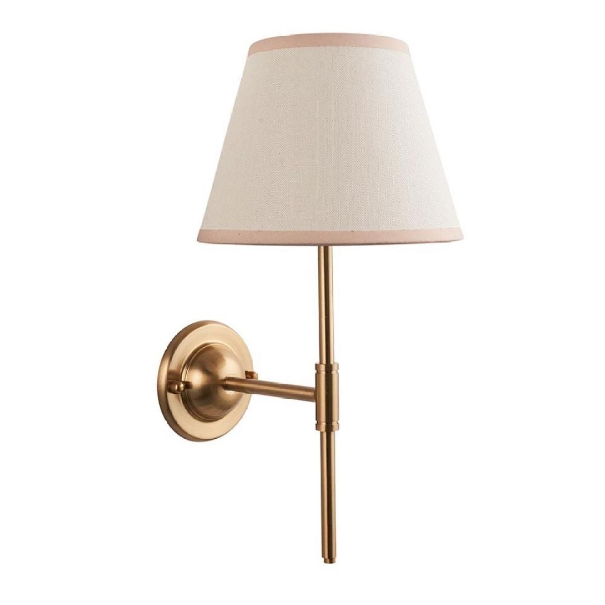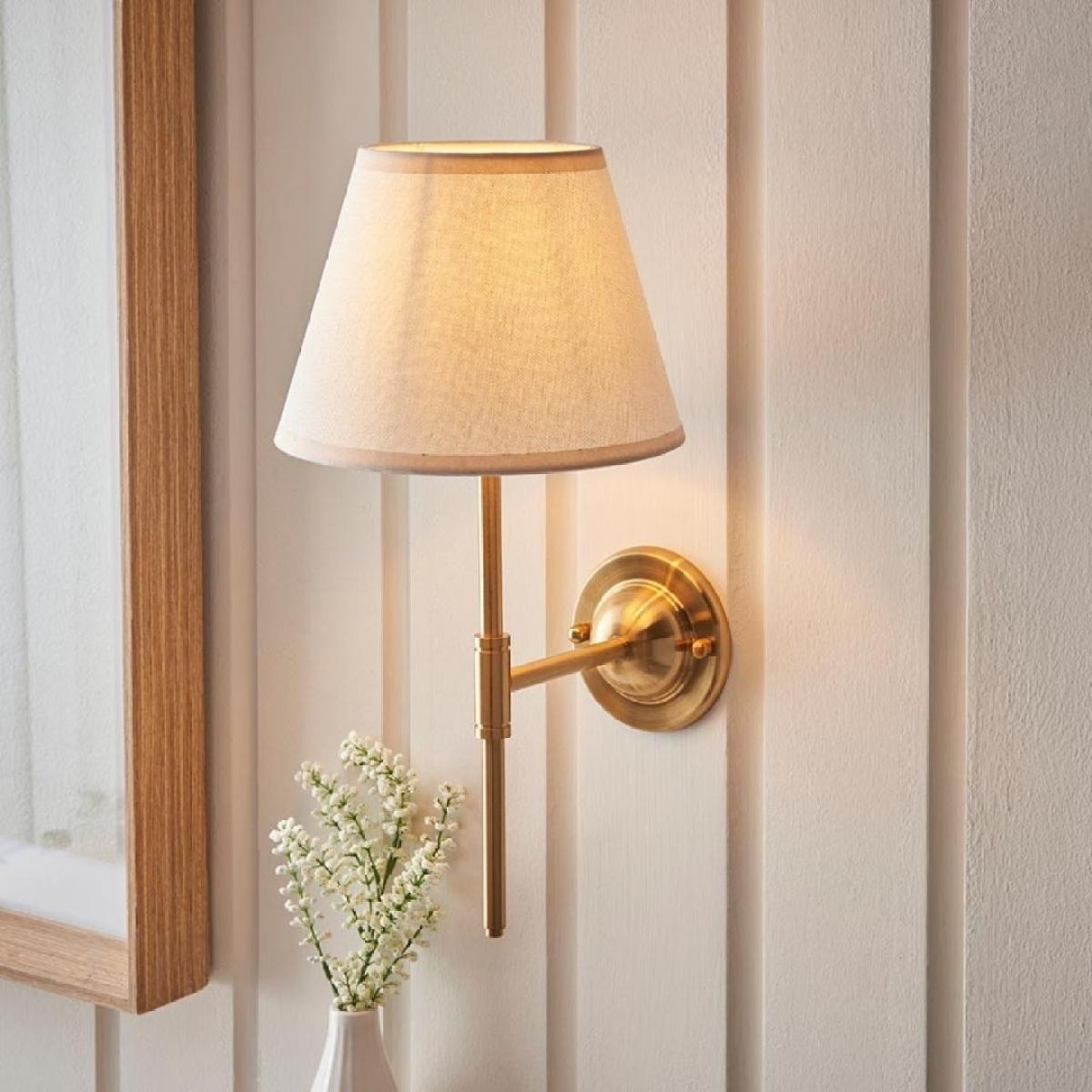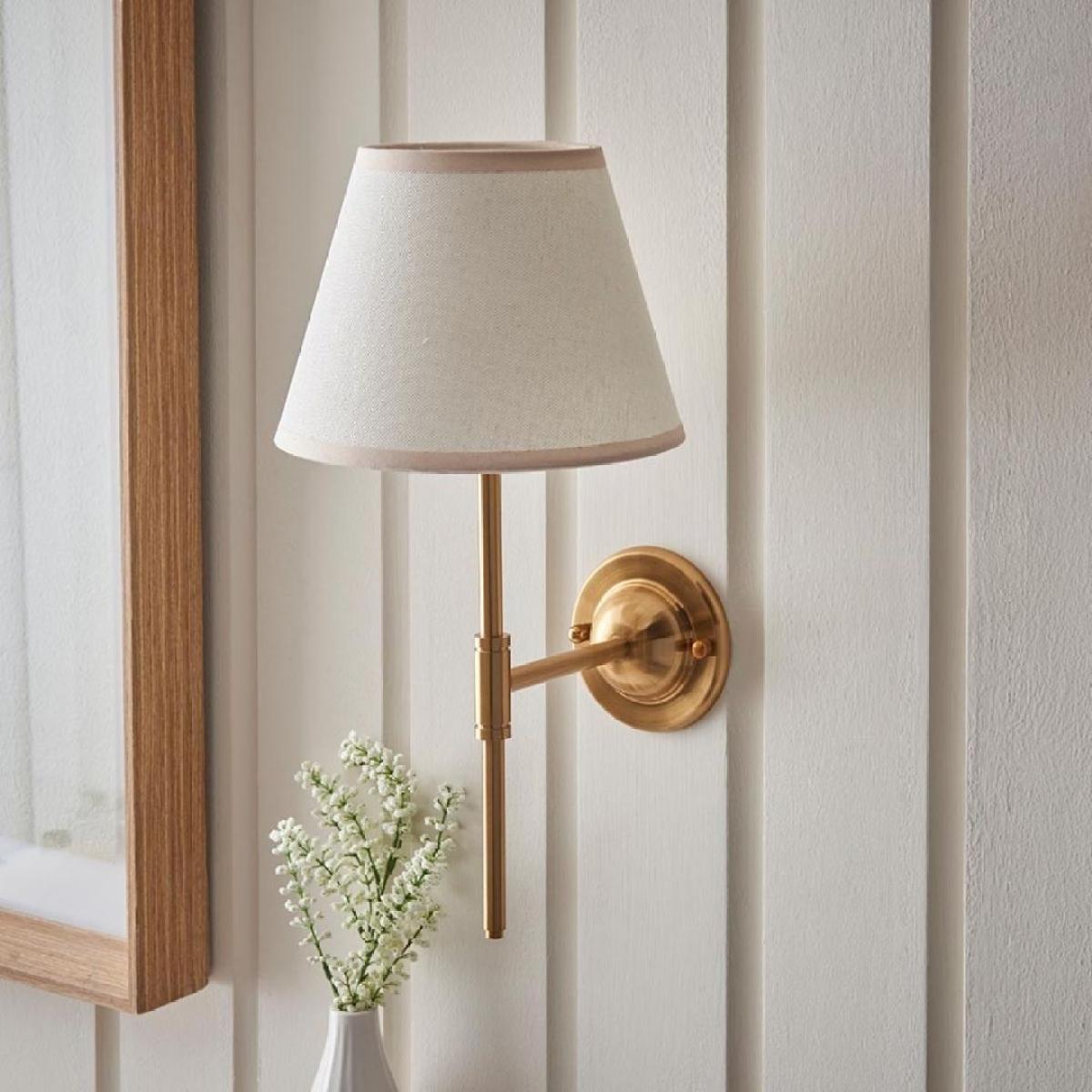 Dome 1-light wall light, featuring a brushed aged brass finish and paired with a handcrafted, vintage white 20cm tapered shade with almond white contrasting taped edge detail. The Dome wall light is a beautifully crafted lighting piece that blends classic elegance with understated sophistication. Featuring a brushed aged brass finish, it exudes timeless charm, while the handcrafted vintage white tapered shade is finished with an almond white contrasting taped edge for a refined touch. Designed with both style and functionality in mind, this wall light features a dome-shaped backplate and an elegantly linear arm, which can be adjusted to achieve the perfect lighting angle. Ideal for hallways, living rooms or bedside placement, it provides a warm and inviting glow, complementing both traditional and contemporary interiors. Dome 1-light wall light, featuring a brushed aged brass finish and paired with a handcrafted, vintage white 20cm tapered shade with almond white contrasting taped edge detail. The Dome wall light is a beautifully crafted lighting piece that blends classic elegance with understated sophistication. Featuring a brushed aged brass finish, it exudes timeless charm, while the handcrafted vintage white tapered shade is finished with an almond white contrasting taped edge for a refined touch. Designed with both style and functionality in mind, this wall light features a dome-shaped backplate and an elegantly linear arm, which can be adjusted to achieve the perfect lighting angle. Ideal for hallways, living rooms or bedside placement, it provides a warm and inviting glow, complementing both traditional and contemporary interiors.