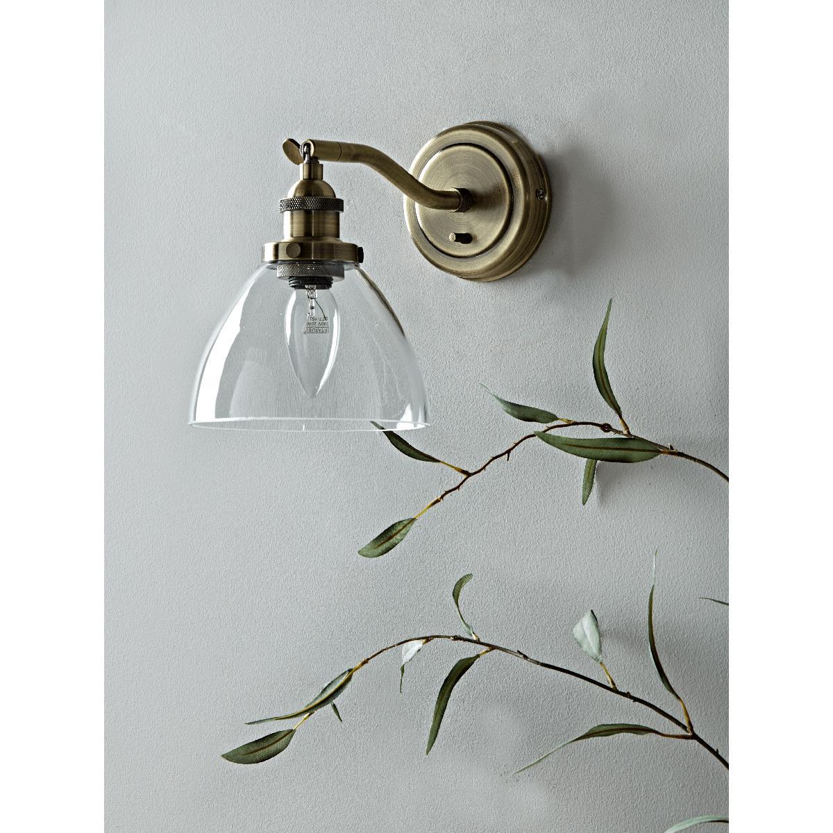 Carefully handblown glass, our contemporary domed shape wall light features a beautiful aged brass neck and matching round fixing. Complete with authentic industrial features, our wall light will complement any interior style and help create a soft glow in your living space, with a pivot feature to the shade to position it how you need it.