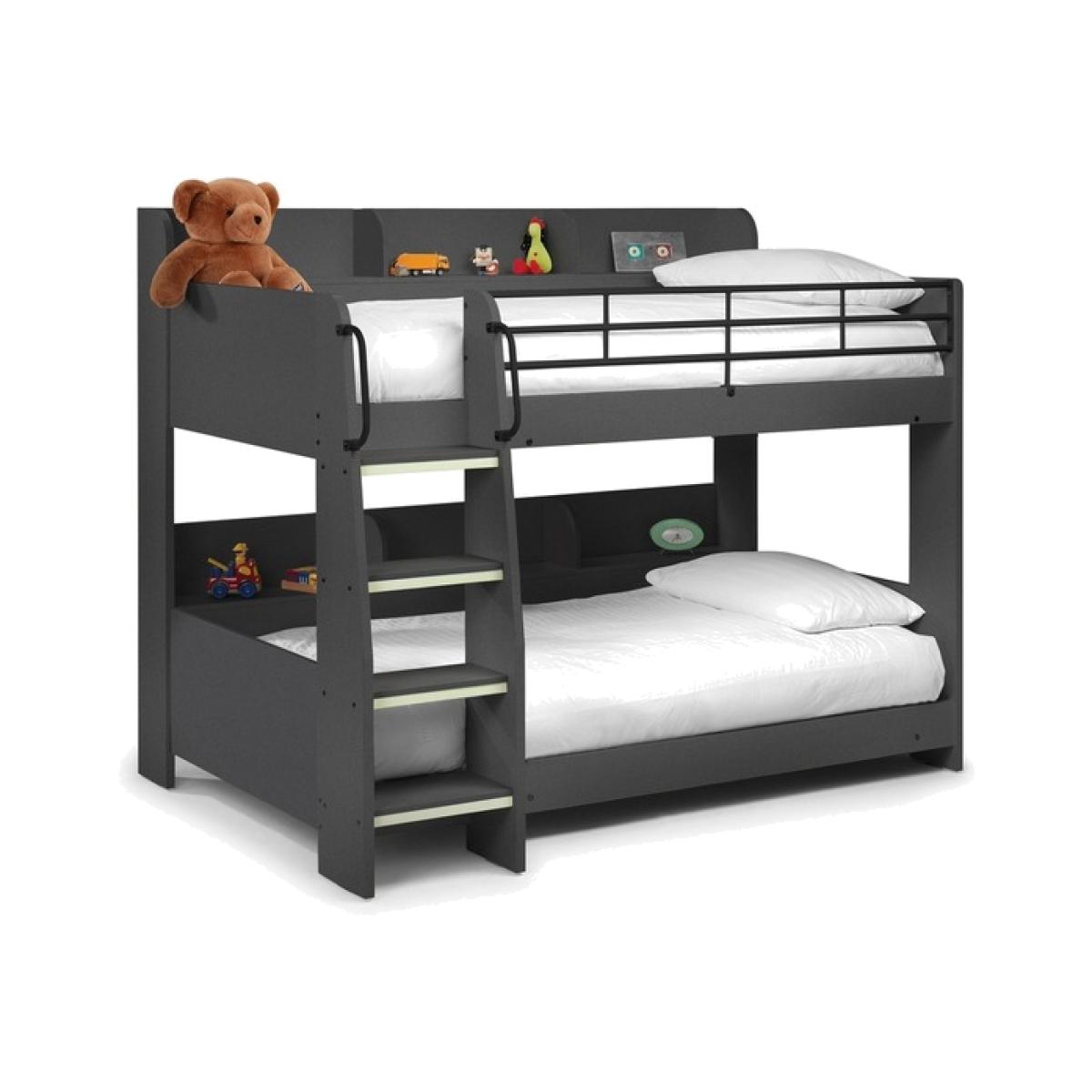 The Domino bunk combines anthracite effect foil to create this stylish bunk bed. Unique to this product is the added shelving along the back of each bunk to give that much needed additional storage space. Another nice feature of the Domino is the Luminous ladder steps that glow in the dark!