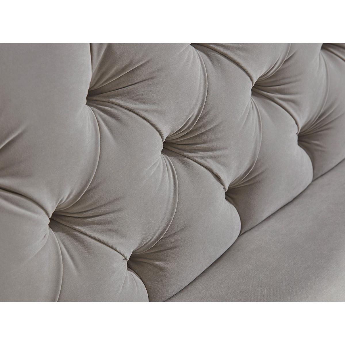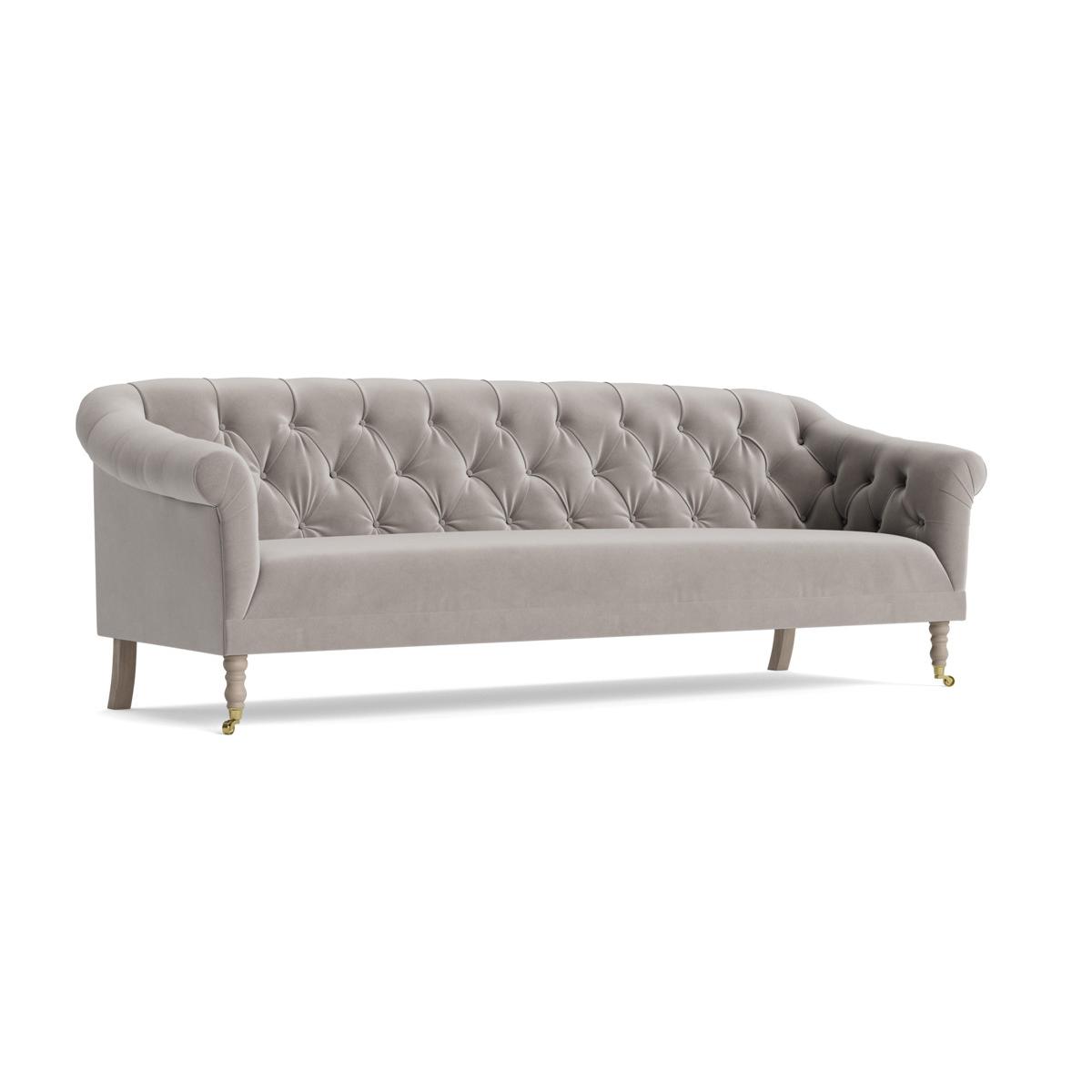 Our elegant Domme range of furniture features a feminine curved frame, scrolled arms and a buttoned backrest. Each piece in the range is upholstered in the fabric and colour of your choice, and comes with a deep, cushioned seat and elegant legs. The front two legs are hand turned and polished with castors for ease of movement, while the back two legs are rectangular for stability. These beautiful pieces will make a fabulous addition to any living space. The Domme range includes two seater and three seater sofas, an armchair and an ottoman. Pictured here in our Dove Velvet material, our Domme collection can be upholstered in a choice of 33 distinctive shades and five fabrics to suit your style. Read our Upholstery FAQs View our full Upholstery Terms and Conditions
