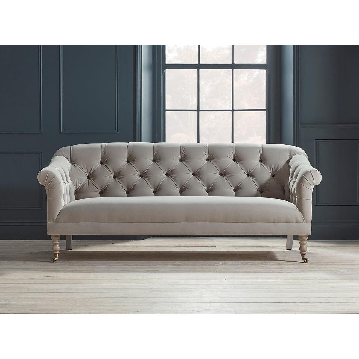 Our elegant Domme range of furniture features a feminine curved frame, scrolled arms and a buttoned backrest. Each piece in the range is upholstered in the fabric and colour of your choice, and comes with a deep, cushioned seat and elegant legs. The front two legs are hand turned and polished with castors for ease of movement, while the back two legs are rectangular for stability. These beautiful pieces will make a fabulous addition to any living space. The Domme range includes two seater and three seater sofas, an armchair and an ottoman. Pictured here in our Dove Velvet material, our Domme collection can be upholstered in a choice of 33 distinctive shades and five fabrics to suit your style. Read our Upholstery FAQs View our full Upholstery Terms and Conditions