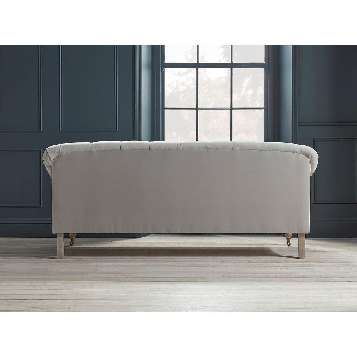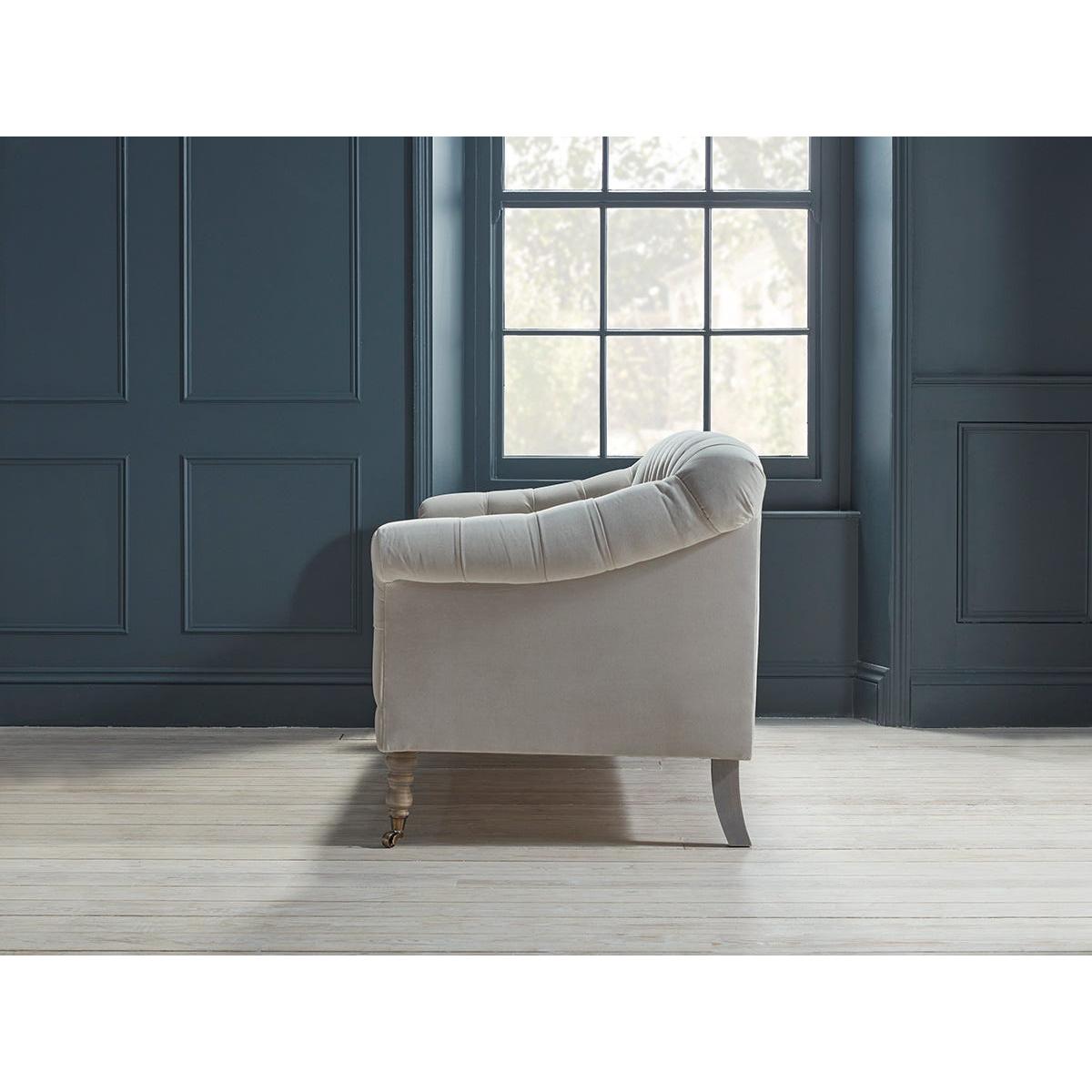Our elegant Domme range of furniture features a feminine curved frame, scrolled arms and a buttoned backrest. Each piece in the range is upholstered in the fabric and colour of your choice, and comes with a deep, cushioned seat and elegant legs. The front two legs are hand turned and polished with castors for ease of movement, while the back two legs are rectangular for stability. These beautiful pieces will make a fabulous addition to any living space. The Domme range includes two seater and three seater sofas, an armchair and an ottoman. Pictured here in our Dove Velvet material, our Domme collection can be upholstered in a choice of 33 distinctive shades and five fabrics to suit your style. Read our Upholstery FAQs View our full Upholstery Terms and Conditions