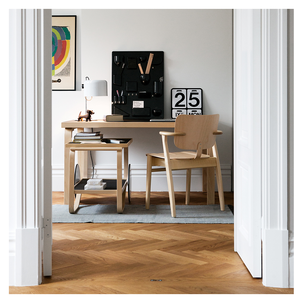 Designed in 1946 by Ilmari Tapiovaara and crafted by Artek, the Domus Chair in natural oak was originally created for the Domus Academica student housing in Helsinki. Intended to support hours of studying, the chair's ergonomic curved seats conform to the body in a comfortable way that supports good posture. Also known as The Finn Chair, the chair's short arms allow it to be placed close to a table making it perfect for use as a dining table or desk chair. Lightweight and stackable, the Domus Chair is expertly crafted from naturally lacquered oak at Artek's factory in Finland. Founded in 1935 by Aino and Alvar Aalto, Maire Gullichsen, and Nils-Gustav Hahl, Artek introduced a new kind of every-day living, and today it is renowned as one of the world's biggest names in interior design.