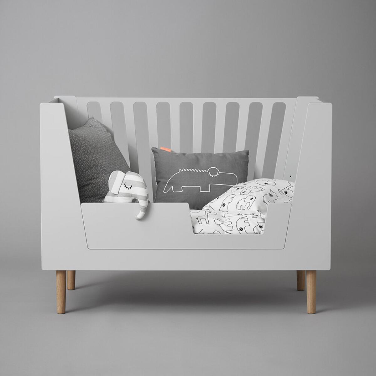 This cot from Done by Deer is classic in design with a modern Scandinavian feel. Retro in its aesthetic, it has a strong plywood base with two adjustable height settings, so it converts to accommodate your child from newborn baby to toddler and beyond. The base can be placed in the upper position for a newborn and should be moved to the lower position when your little one becomes more active. The front rail can be removed and replaced with a. Step-in guard. (available separately) to become a stylish toddler bed or a comfortable sofa. It’s a wonderful addition to your stylish nursery.
