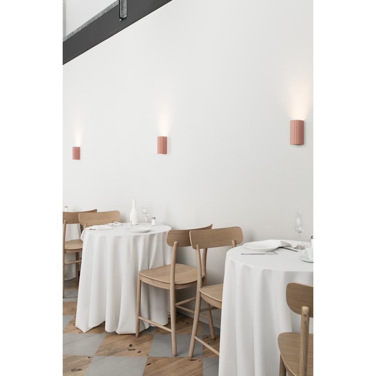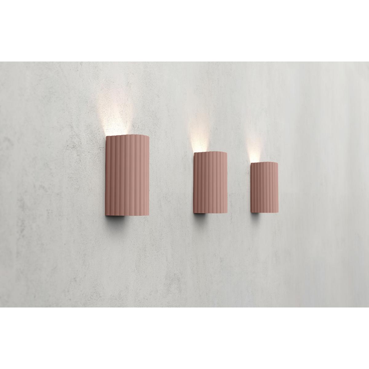 I love this wall light because its soft blush tone and textured ribbed design add a subtle yet sophisticated touch to any space. It works particularly well in contemporary or minimalist interiors, where it can serve as a statement piece without overwhelming the room. For styling, consider placing it in bedrooms or living rooms to create a warm, inviting glow, or use it to highlight feature walls. For practical tips, position it at eye level or slightly above furniture to ensure the light disperses evenly and enhances the overall ambiance. Its muted colour makes it versatile, pairing well with neutral palettes or contrasting boldly against darker walls for added visual interest.