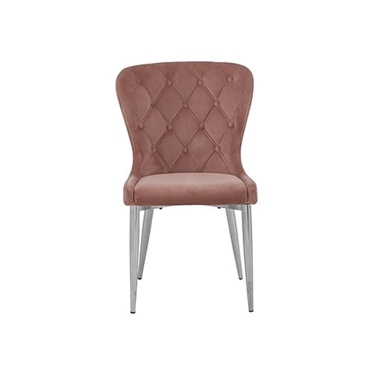 Dine in velvet luxury. The Donnie chairs curved, buttoned back and cushioned seat will spoil you and your guests. In a choice of three gorgeous colours. Why youll love it Lavishly buttoned, with a grandly curved back. Exquisitely tailored, softly cushioned. Upholstered in tactile velvet. In contemporary silver, navy or blush velvet. Polished chrome or matt black metal legs. Coordinates perfectly with the Olympia round tables. What you need to know The black or chrome finish legs are made of strong steel. Cushioned seats and backs are foam- filled. Flattening and shading of heavy wear areas on velvet is unavoidable. Pile fabrics may be vacuumed lightly using the curtain attachment. Brush regularly in the direction of the pile with a soft brush.