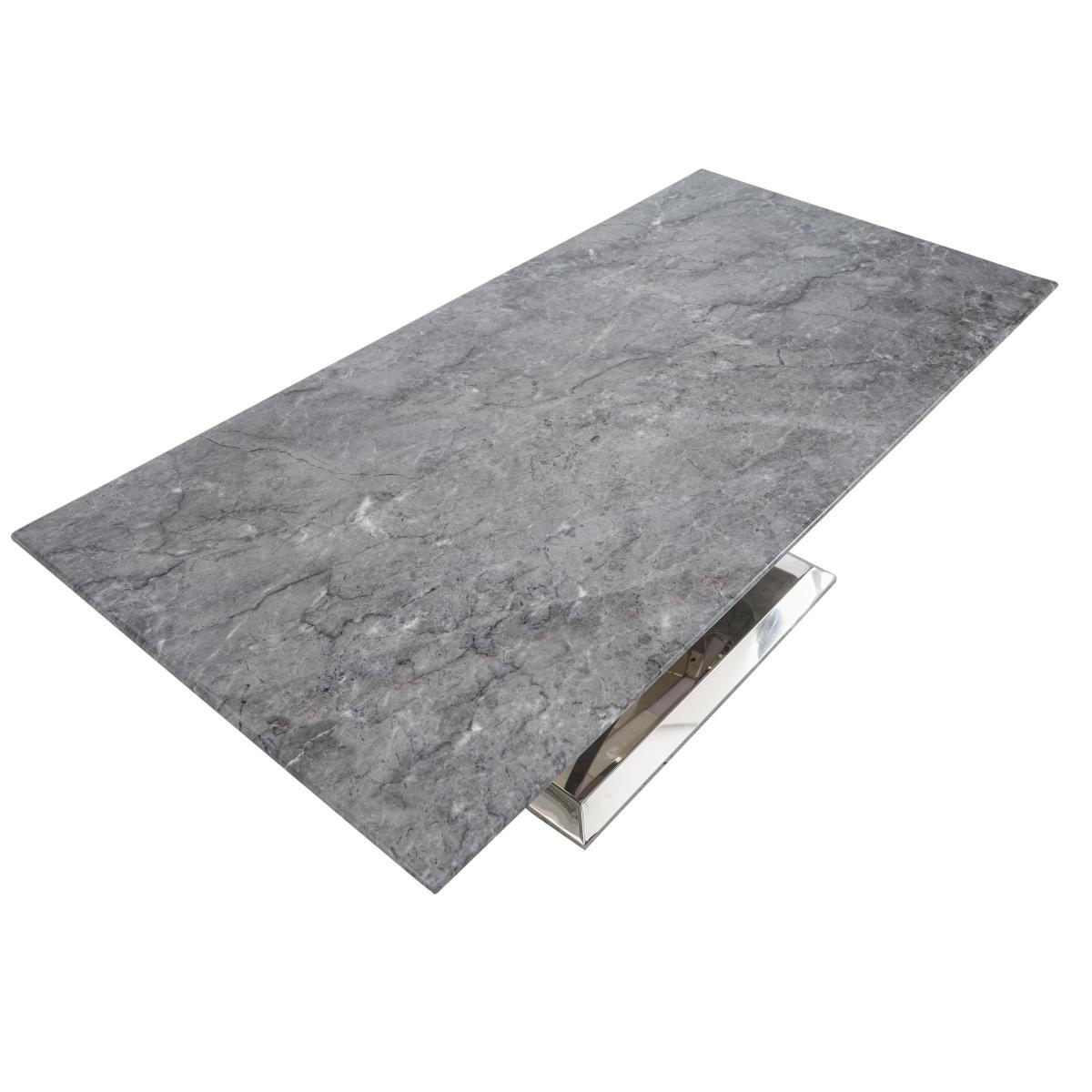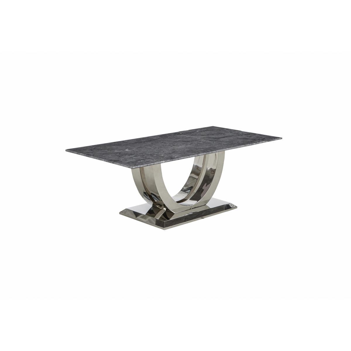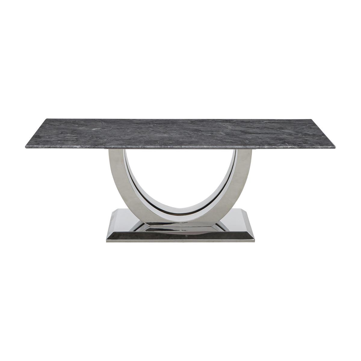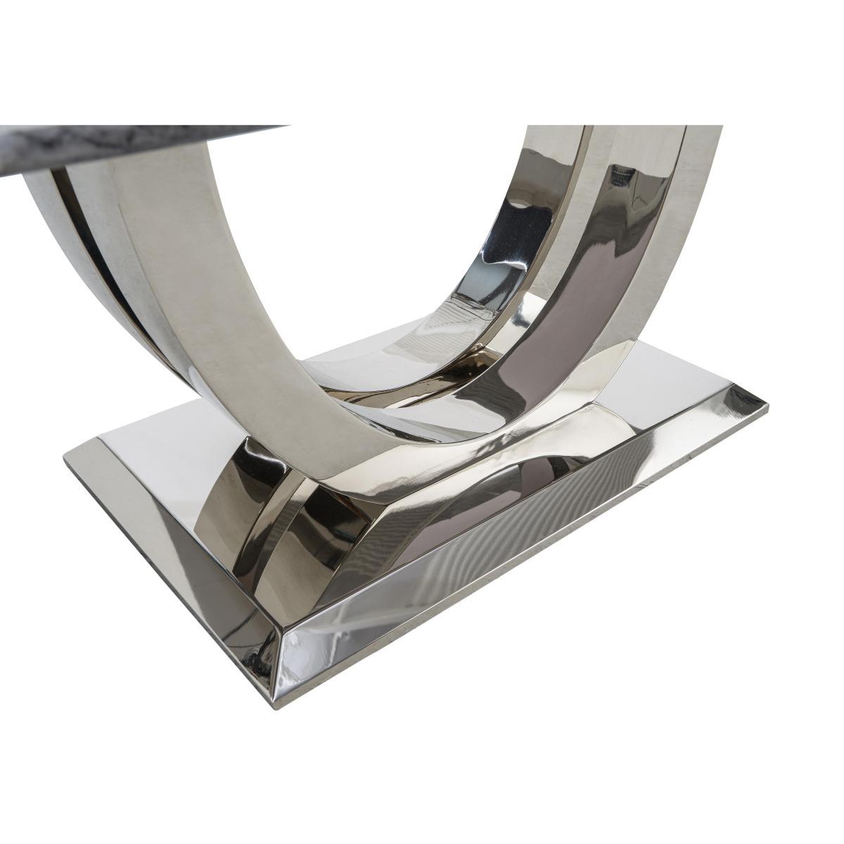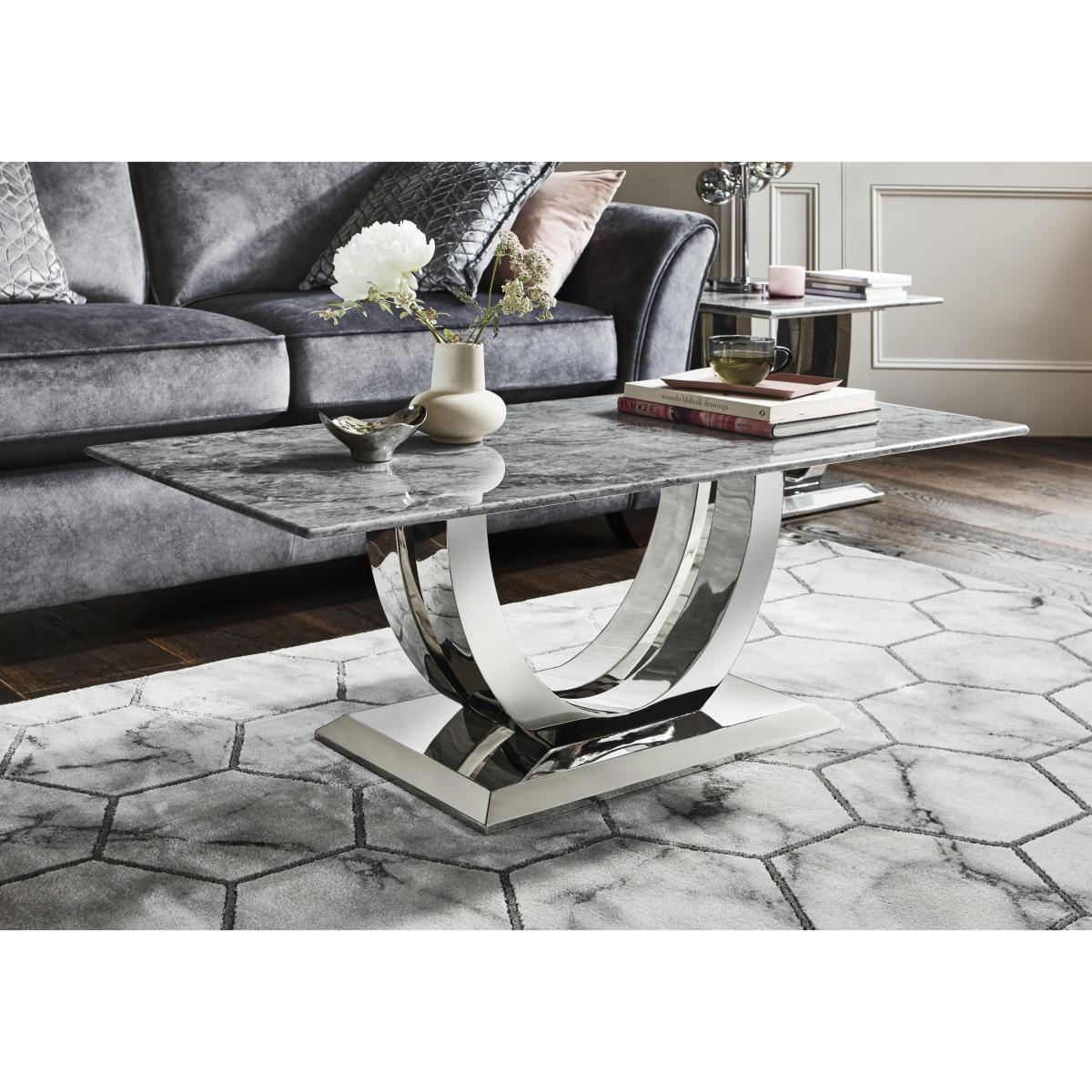 Welcome to high glamour, luxurious living. The Donnie dining and occasional range stars a statement marble dining table with a spectacular curved base in polished chrome-finished steel. The collection includes marbled topped occasional pieces and lavishly buttoned velvet chairs, benches and bar stools. High end designer style at a fantastic value price. Make a statement and add luxury to your living room with this glamorous statement coffee table in marble and chrome-finished steel. At a great value price. Why you'll love it. Stunning designer marble coffee table. Ultra-glamorous, contemporary good looks. Elegantly slim profile top. Solid marble with dark grey marble look veneers. Striking curved statement base. In steel finished with glossy chrome. Beautiful design and a high quality finish for a fantastic value price. What you need to know. Top is solid white marble with a marble effect veneer finish. Base is stainless steel with a chrome finish. Every piece of marble is unique and will vary in colour. Veins and pores are natural and part of marble’s beauty. As a soft stone, marble can be susceptible to chips, stains, cracks, scratches and discolouration, so it’s important to care for it properly. Spillages need to be removed immediately. To clean, wipe gently with a damp cloth using warm water, then buff dry. We recommend that you use coasters and place mats to protect against heat and moisture. Do not use knives to cut food on a marble table top, use as a work top, place heavy weights on the table or use acidic or abrasive cleaners. You should never sit or stand on a marble surface. For more advice on caring for your marble furniture, see our. Dining care guide. Part of the Donnie range of contemporary marble dining and occasional furniture.