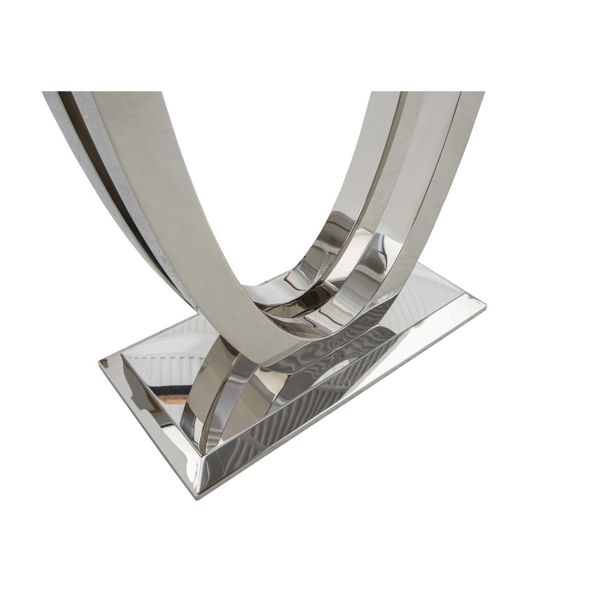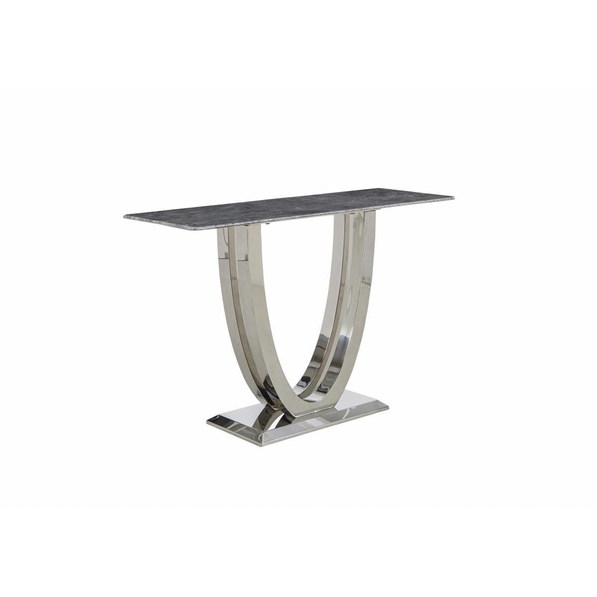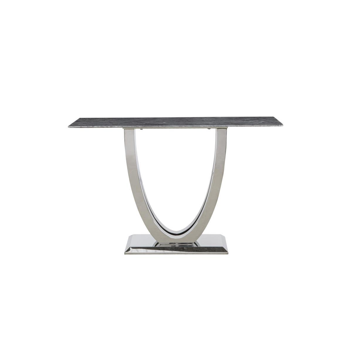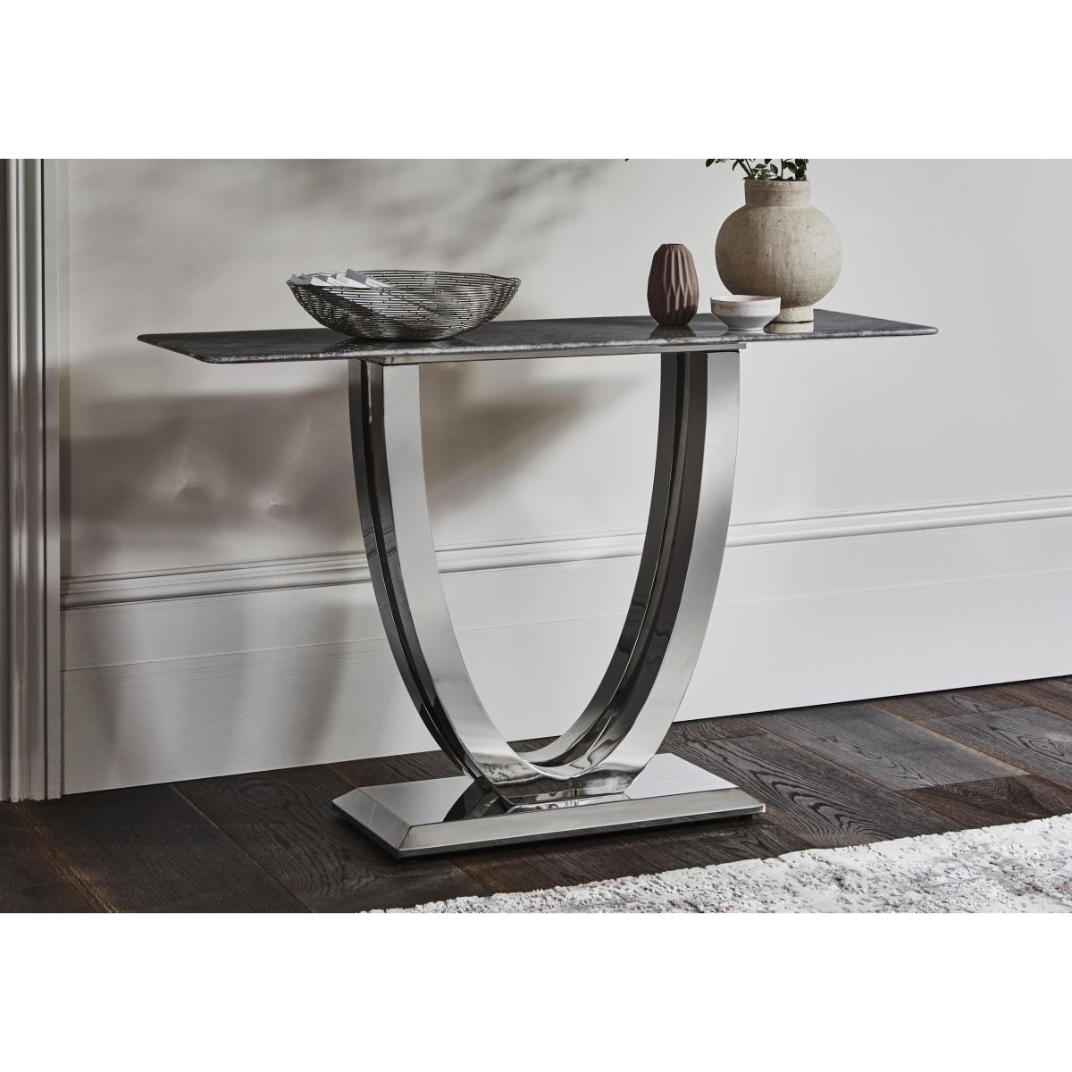 Welcome to high glamour, luxurious living. The Donnie dining and occasional range stars a statement marble dining table with a spectacular curved base in polished chrome-finished steel. The collection includes marbled topped occasional pieces and lavishly buttoned velvet chairs, benches and bar stools. High end designer style at a fantastic value price. Give your hallway or living room the ‘wow factor. The glamorous Donnie console table is a masterpiece in marble and chrome finished steel, making a strong style statement. Why you'll love it. Stunning designer marble console table. Perfect in a hallway or living room. Ultra-glamorous, contemporary good looks. Elegantly slim profile top. Solid marble with dark grey marble look veneers. Striking curved statement base. In steel finished with glossy chrome. Beautiful design and a high quality finish for a fantastic value price. What you need to know. Top is solid white marble with a marble effect veneer finish. Base is stainless steel with a chrome finish. Every piece of marble is unique and will vary in colour. Veins and pores are natural and part of marble’s beauty. As a soft stone, marble can be susceptible to chips, stains, cracks, scratches and discolouration, so it’s important to care for it properly. Spillages need to be removed immediately. To clean, wipe gently with a damp cloth using warm water, then buff dry. We recommend that you use coasters and place mats to protect against heat and moisture. Do not use knives to cut food on a marble table top, use as a work top, place heavy weights on the table or use acidic or abrasive cleaners. You should never sit or stand on a marble surface. For more advice on caring for your marble furniture, see our. Dining care guide. Part of the Donnie range of contemporary marble dining and occasional furniture. WARNING!. Furniture can tip over unexpectedly and cause injury. This item should be fixed to a wall using the anti-tip kit provided with the furniture. Be sure to use the correct wall fixings suitable for the walls in your home.
