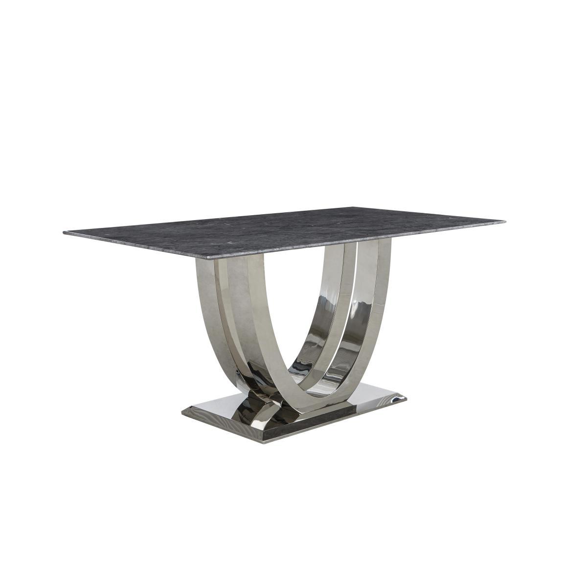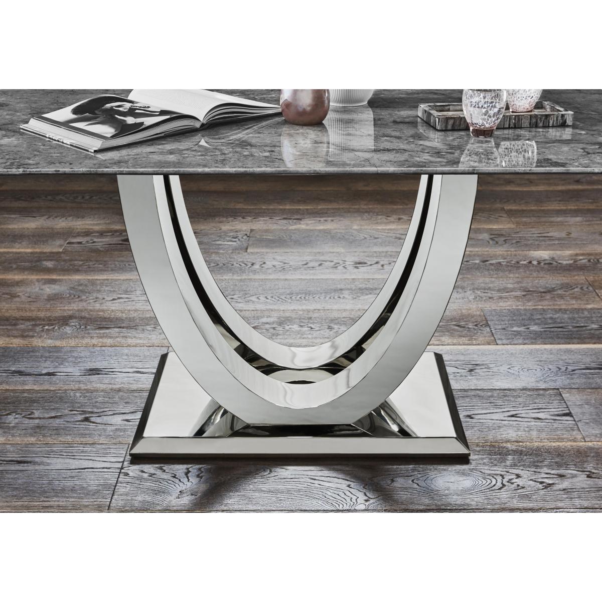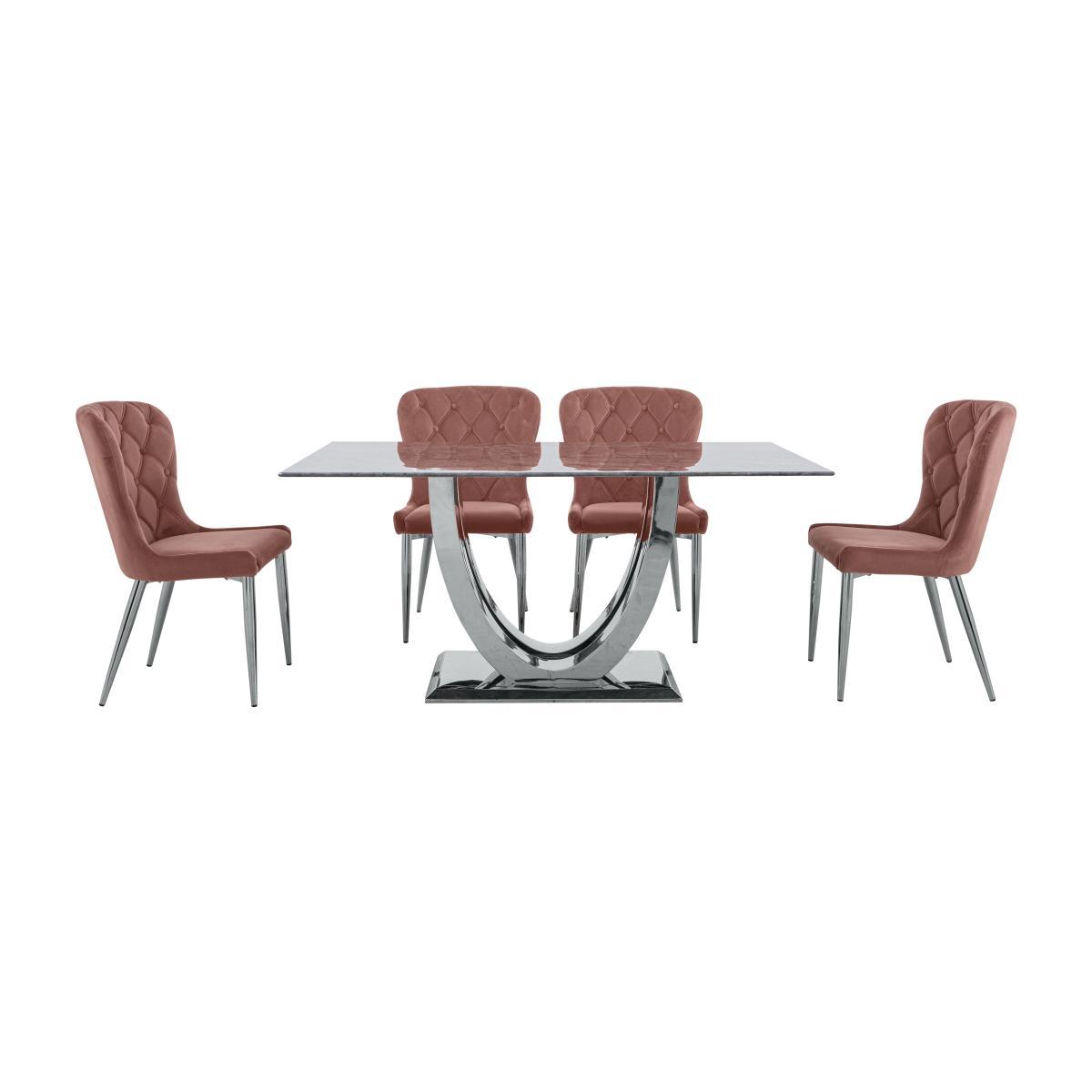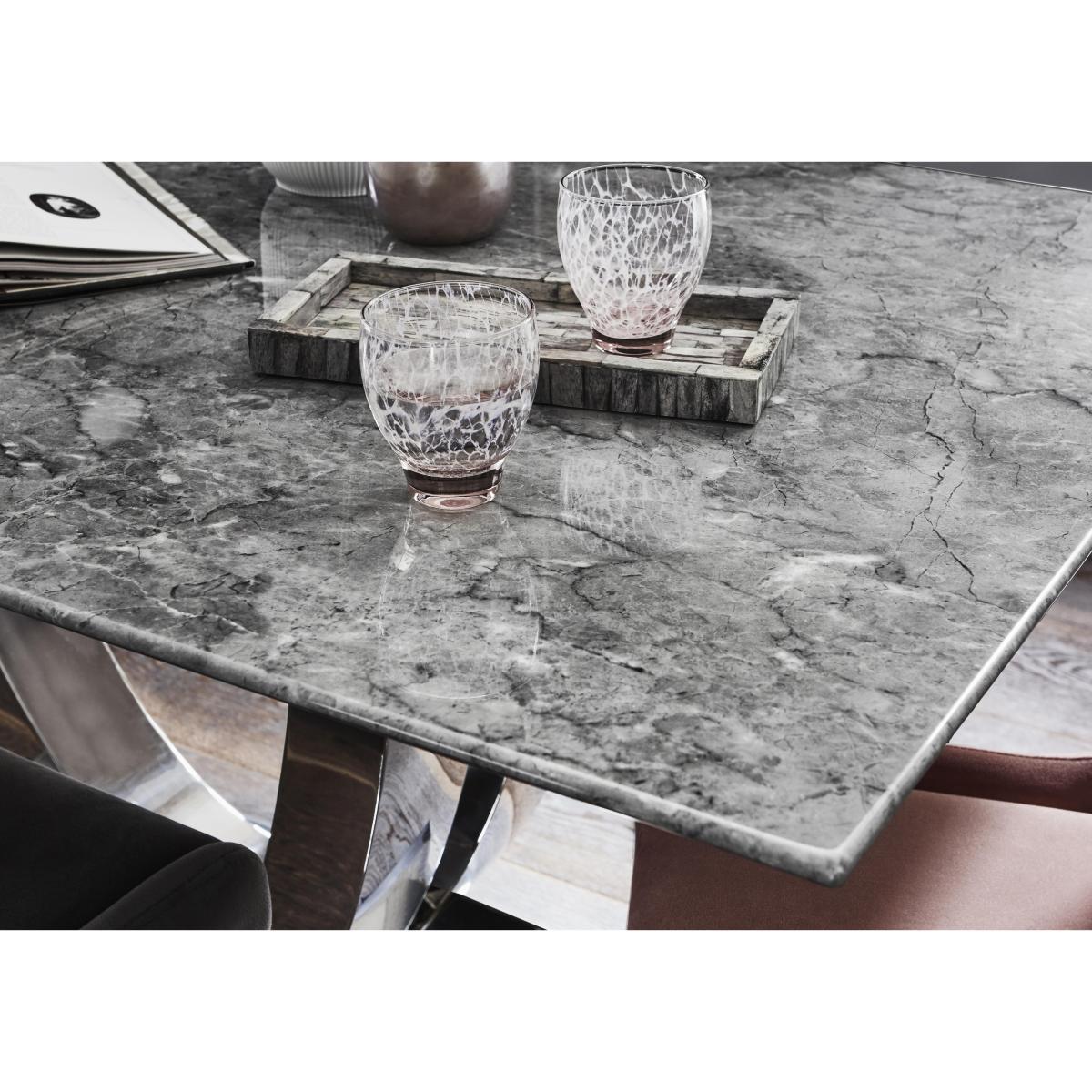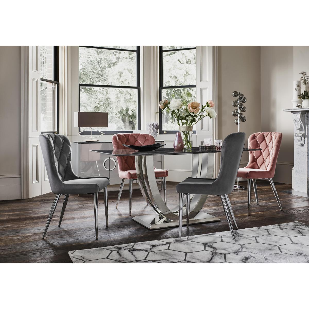Welcome to high glamour, luxurious living. The Donnie dining and occasional range stars a statement marble dining table with a spectacular curved base in polished chrome-finished steel. The collection includes marbled topped occasional pieces and lavishly buttoned velvet chairs, benches and bar stools. High end designer style at a fantastic value price. Choose ultra-glamorous style with this stunning dining set. The dining table is luxury marble with a statement chrome finish base while the chairs are tactile buttoned velvet. Ultra-glamorous, contemporary marble dining set. Dining table seats up to 6. Solid marble top with dark grey marble look veneers. On a striking curved chrome finish steel base. 4 lavishly buttoned dining chairs, with grandly curved backs. In tactile velvet in a choice of shades. With polished chrome or matt black finish steel legs. High end dining for a fantastic value price. What you need to know. Rectangular dining table seats 4-6 people. Dining chair seats and backs are foam filled.li>. Flattening and shading of heavy wear areas on velvet is unavoidable. Pile fabrics may be vacuumed lightly using the curtain attachment. Brush regularly in the direction of the pile with a soft brush. Dining table top is solid white marble with a marble effect veneer finish. Every piece of marble is unique and will vary in colour. Veins and pores are natural and part of marble’s beauty. As a soft stone, marble can be susceptible to chips, stains, cracks, scratches and discolouration, so it’s important to care for it properly. Spillages need to be removed immediately. To clean, wipe gently with a damp cloth using warm water, then buff dry. We recommend that you use coasters and place mats to protect against heat and moisture. Do not use knives to cut food on a marble table top, use as a work top, place heavy weights on the table or use acidic or abrasive cleaners. You should never sit or stand on a marble surface. For more advice on caring for your marble furniture, see our. Dining care guide.