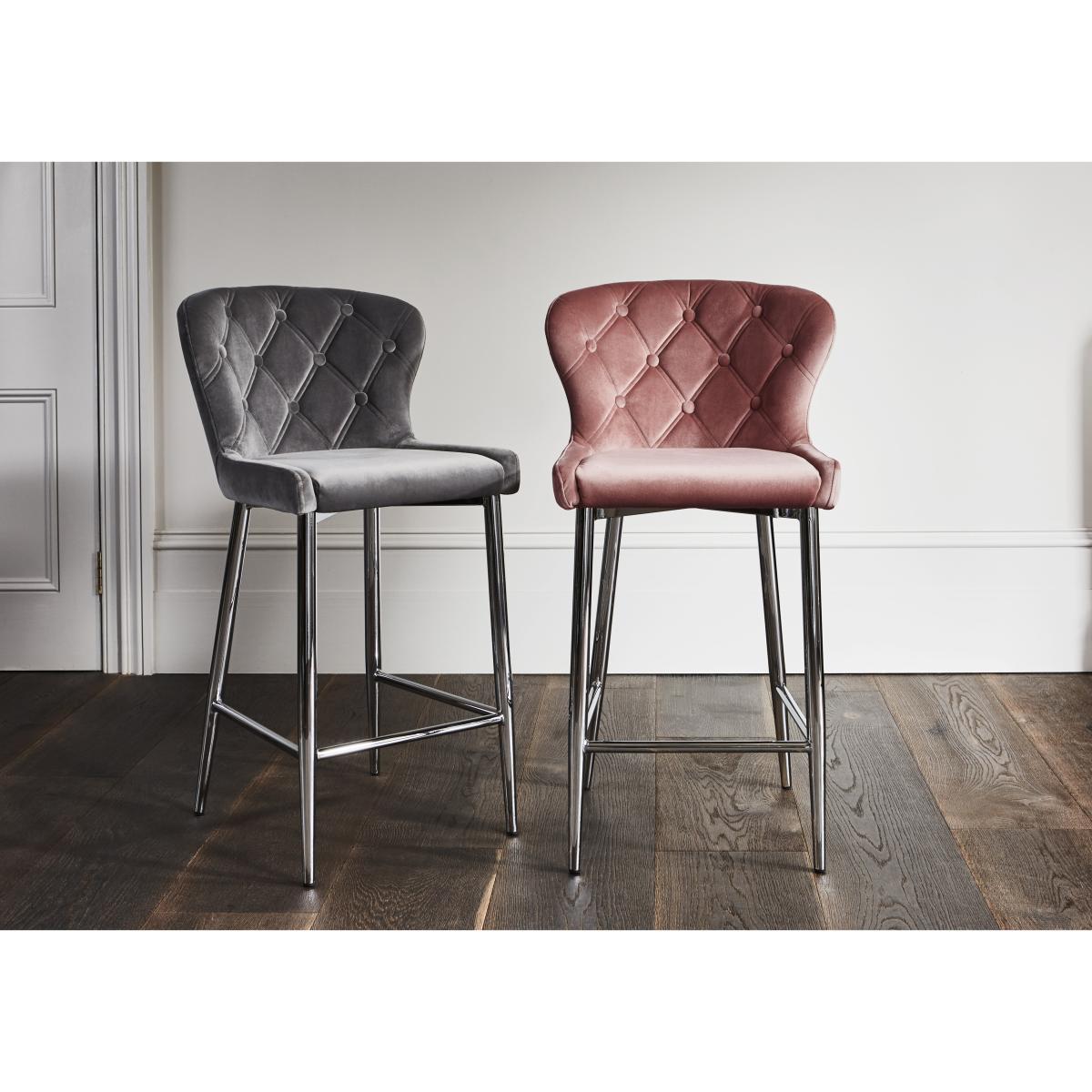 Welcome to high glamour, luxurious living. The Donnie dining and occasional range stars a statement marble dining table with a spectacular curved base in polished chrome-finished steel. The collection includes marbled topped occasional pieces and lavishly buttoned velvet chairs, benches and bar stools. High end designer style at a fantastic value price. Drinks and nibbles have never been so luxurious. The Donnie fabric bar stool has a curved, buttoned back and comfy cushioned seat. Why you'll love it Perfect for kitchen islands or bar tables. Grab breakfast or relax and socialise in comfort. Glamorous, contemporary style in tactile velvet. Lavishly buttoned, with a grandly curved back. Exquisitely tailored, softly cushioned. With polished chrome finished steel legs. . What you need to know The chrome finish legs are made of strong steel. Cushioned seats and backs are foam-filled. Flattening and shading of heavy wear areas on velvet is unavoidable. Pile fabrics may be vacuumed lightly using the curtain attachment. Brush regularly in the direction of the pile with a soft brush.