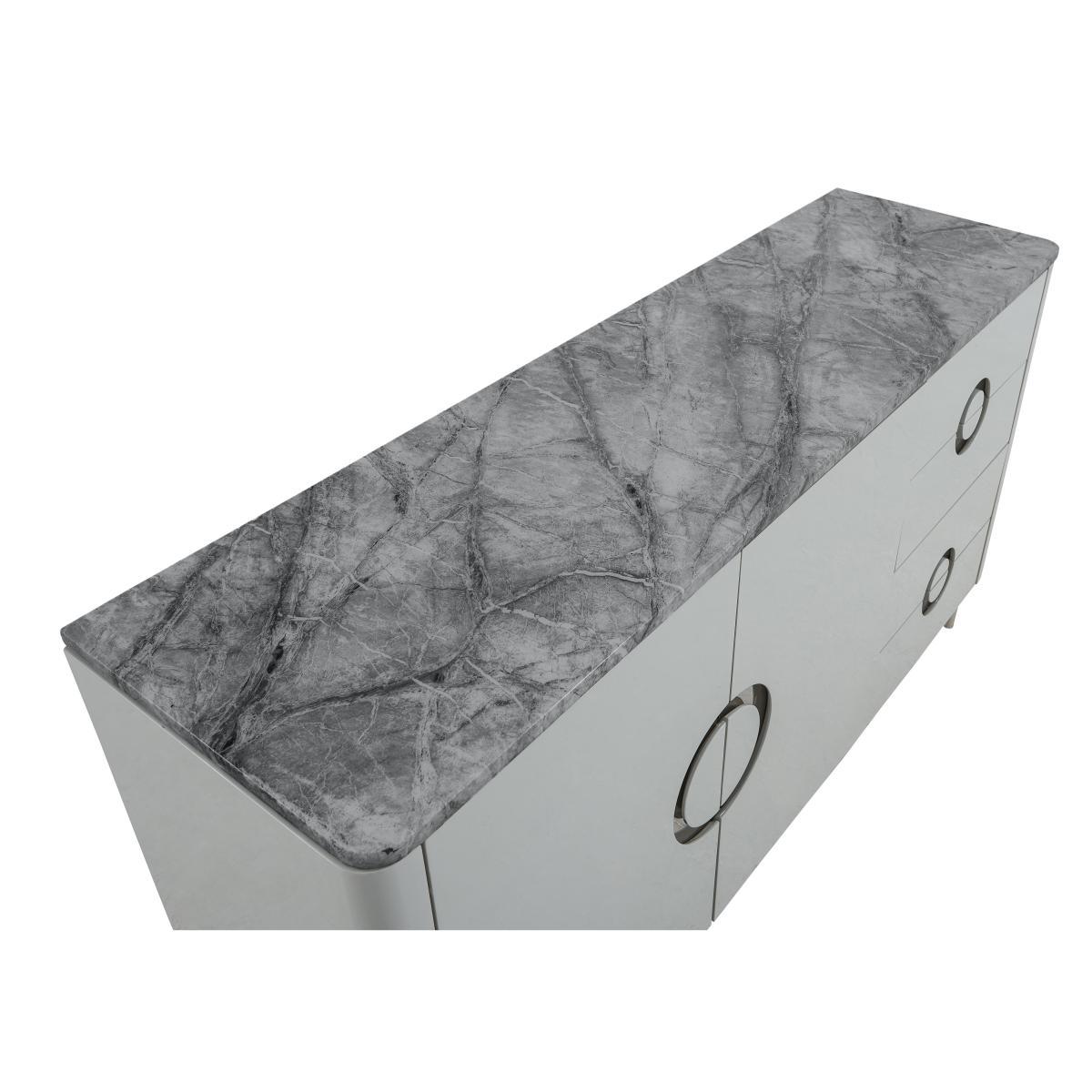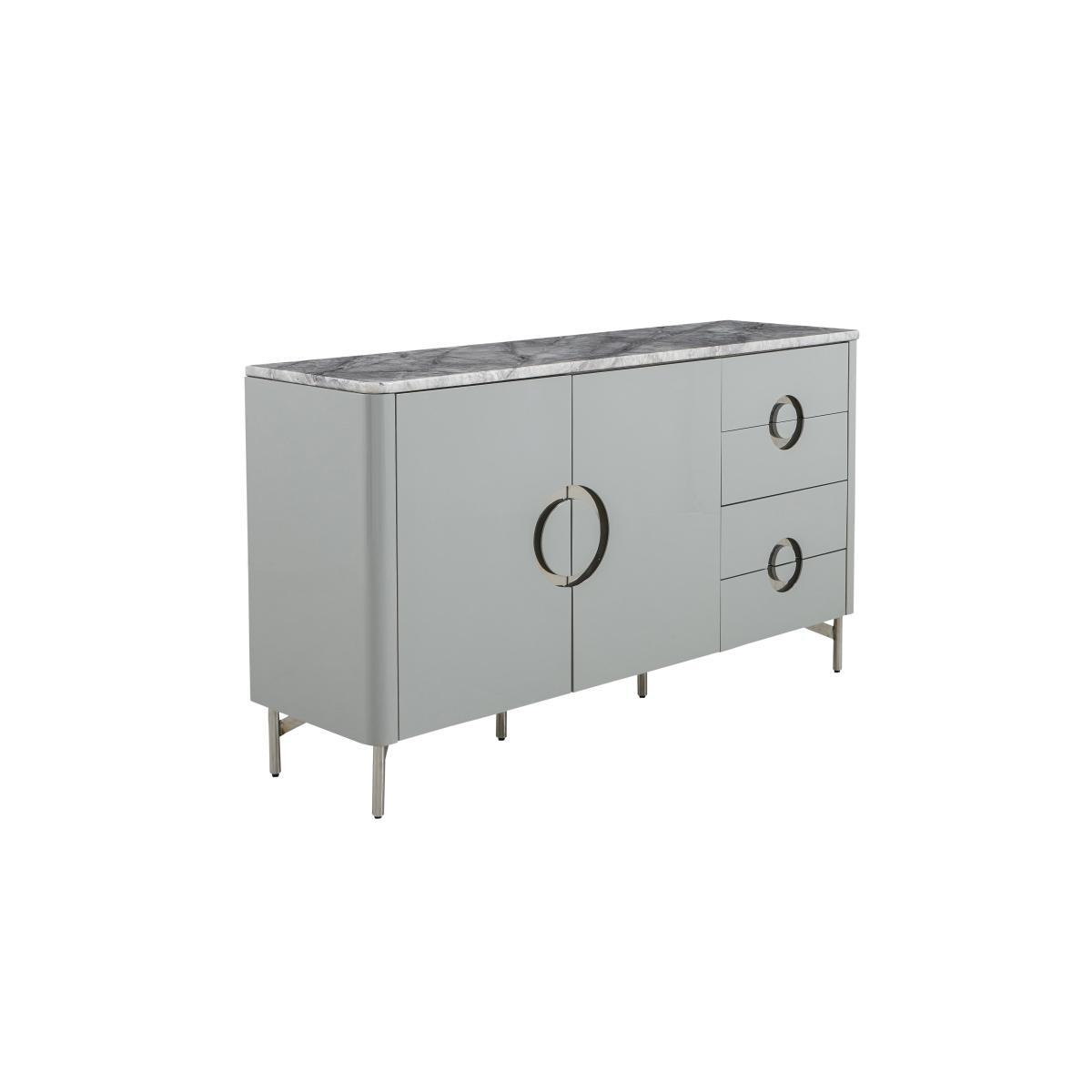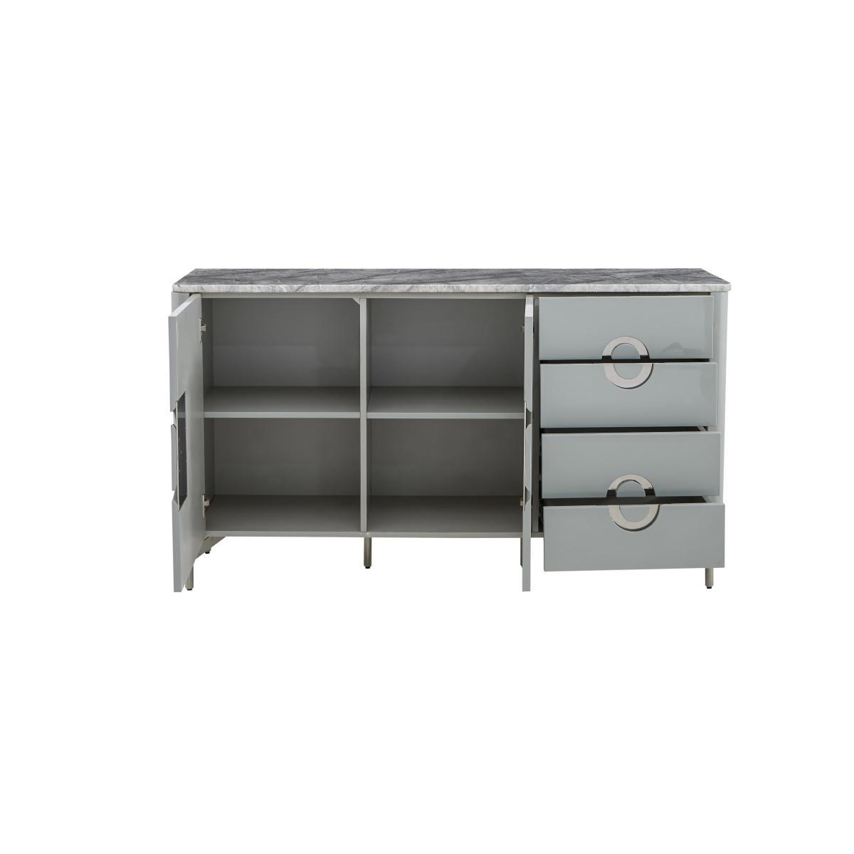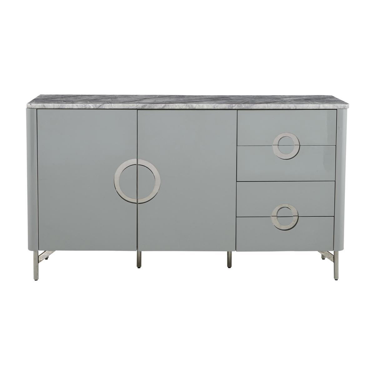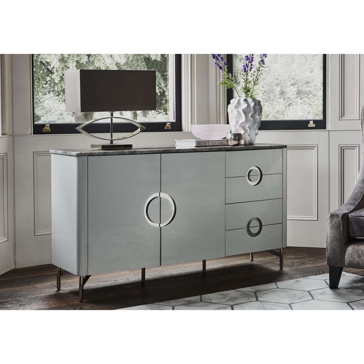 Welcome to high glamour, luxurious living. The Donnie dining and occasional range stars a statement marble dining table with a spectacular curved base in polished chrome-finished steel. The collection includes marbled topped occasional pieces and lavishly buttoned velvet chairs, benches and bar stools. High end designer style at a fantastic value price. Glossy, contemporary sideboard with a marble top and distinctive round inset door and drawer handles. Coordinates beautifully with the glamorous Donnie marble dining sets. Why you'll love it. Luxurious marble-topped sideboard. Ultra-glamorous, contemporary style, with curved corners. And a high gloss grey finish. 4 drawers. 2 spacious cupboards with adjustable shelves. Solid marble top with dark grey marble look veneers. Modern steel legs in glossy chrome. Beautiful design and a high quality finish for a fantastic value price. What you need to know. Top is solid white marble with a marble effect veneer finish. The base is MDF with a high gloss grey lacquer finish. Every piece of marble is unique and will vary in colour. Veins and pores are natural and part of marble’s beauty. As a soft stone, marble can be susceptible to chips, stains, cracks, scratches and discolouration, so it’s important to care for it properly. Spillages need to be removed immediately. To clean, wipe gently with a damp cloth using warm water, then buff dry. We recommend that you use coasters and place mats to protect against heat and moisture. Do not use knives to cut food on a marble top, use as a work top, place heavy weights on the table or use acidic or abrasive cleaners. You should never sit or stand on a marble surface. For more advice on caring for your marble furniture, see our. Dining care guide. Part of the Donnie range of contemporary marble dining furniture. WARNING!. Furniture can tip over unexpectedly and cause injury. This item should be fixed to a wall using the anti-tip kit provided with the furniture. Be sure to use the correct wall fixings suitable for the walls in your home.