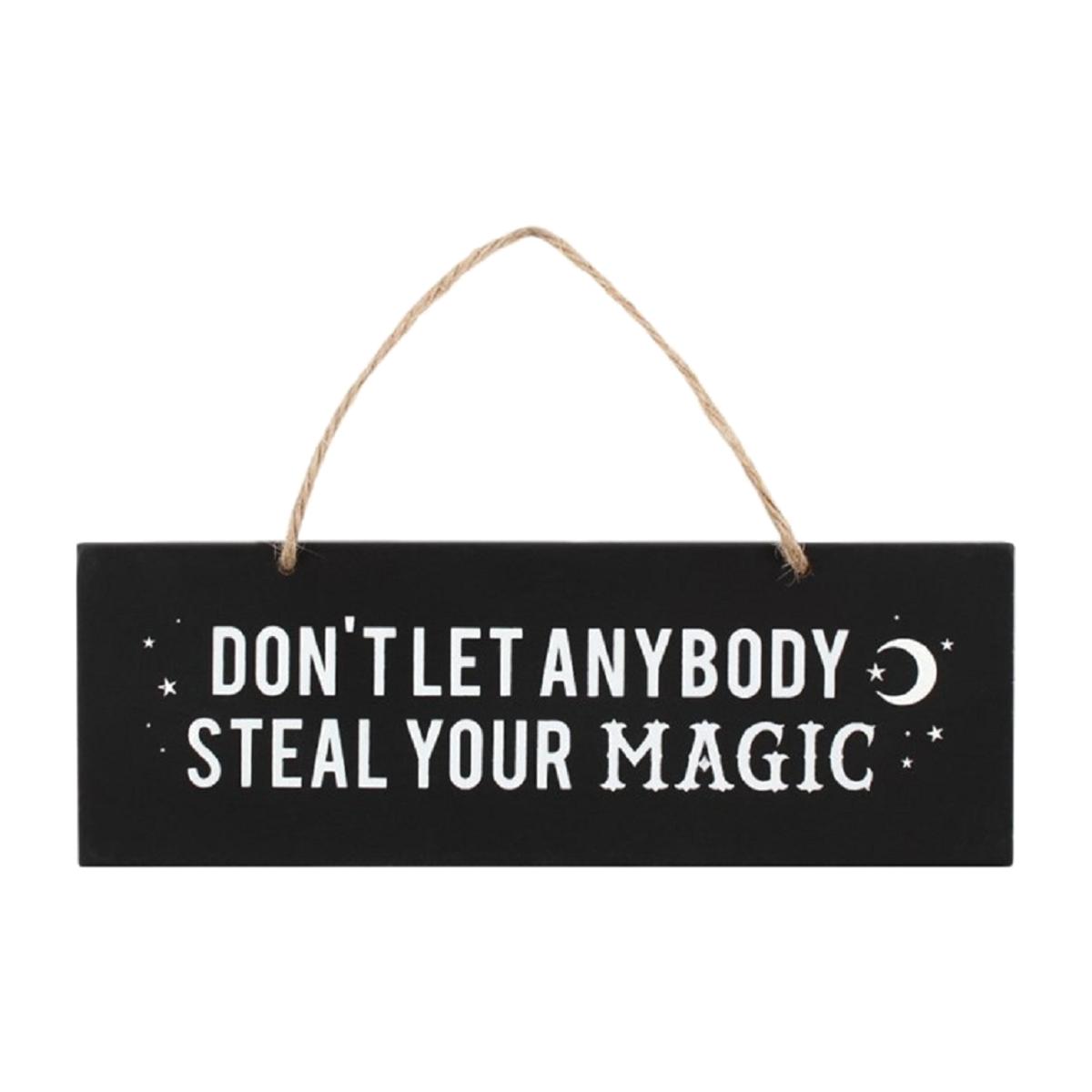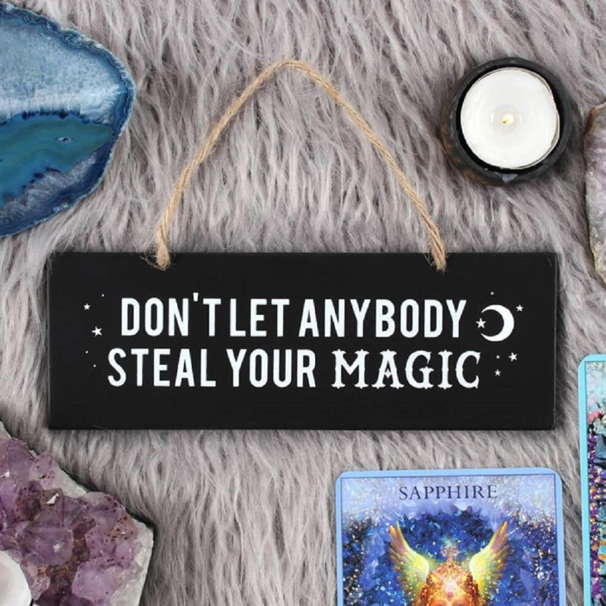 Black hanging wall sign featuring the text 'Don't let anybody steal your magic'.
