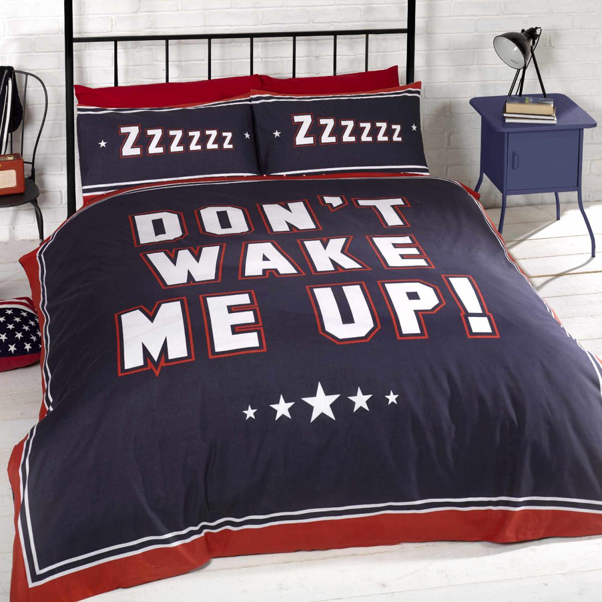 Perfect for the teenagers, this striking 'dont wake me up' duvet cover is printed with a varsity feel. Features a stripe reverse.