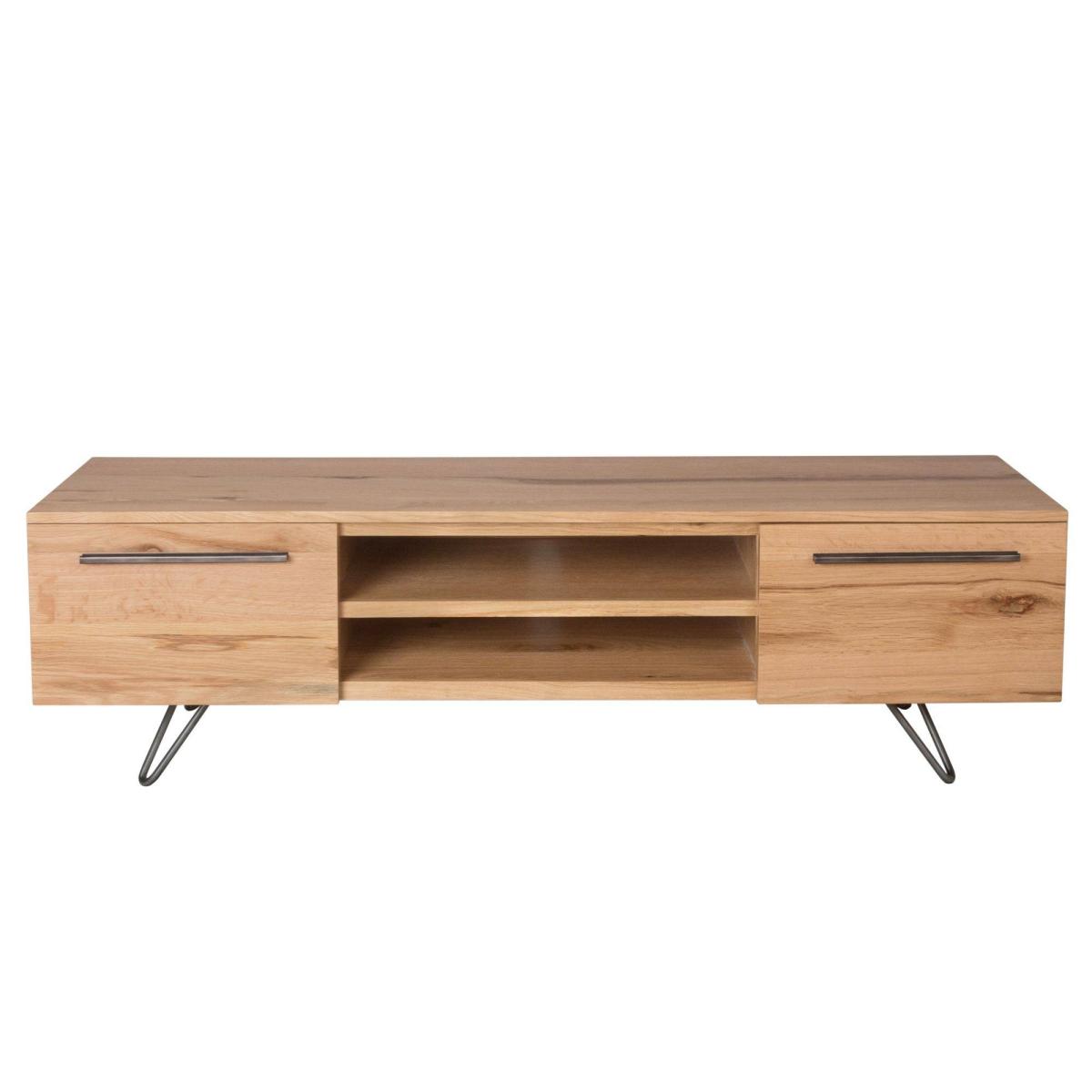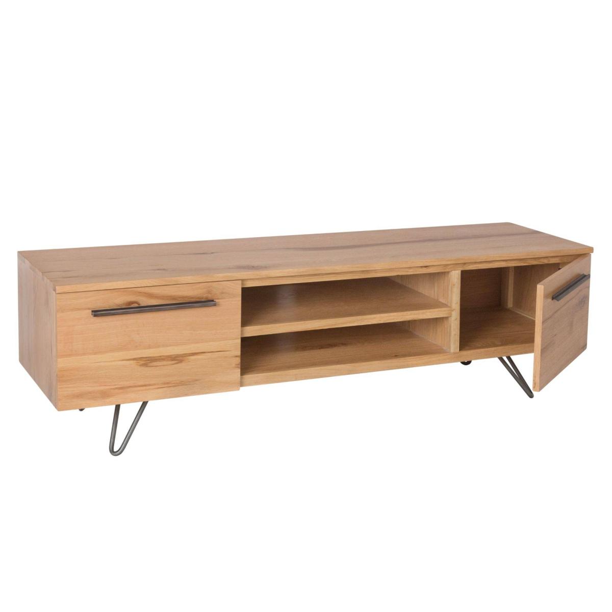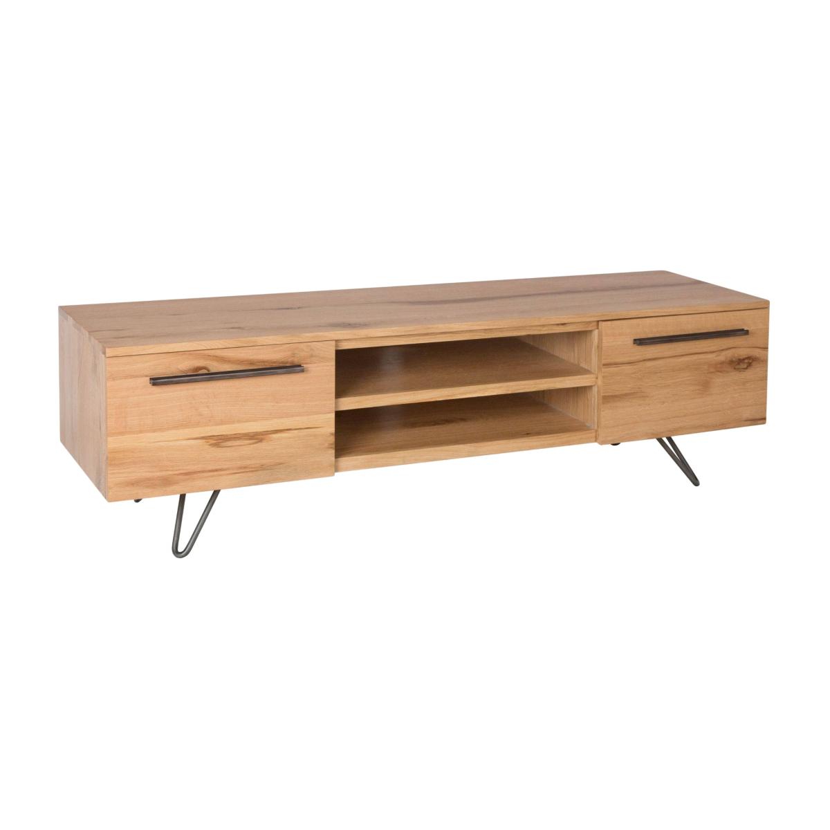 Contemporary rustic oak and gunmetal grey tv cabinet. Showcasing the beauty of timber in all of its glory, this stylish and contemporary Donte tv cabinet will create a vintage and Scandinavian atmosphere in your home. Hairpin gunmetal grey legs support a beautiful rustic oak media stand featuring 2 cabinet doors and 2 open shelves, perfect for supporting TVs up to 55 inches and storing your gaming consoles and multimedia devices. Check out the rest of the Donte range for matching statement pieces.