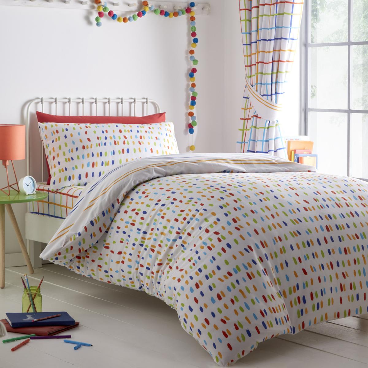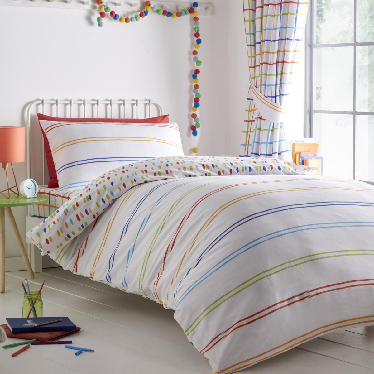 Mix and match this wonderfully fun duvet cover with matching curtains, fitted sheets and a quilted throw. The duvet cover and throw are fully reversible so you can create a new look in seconds, just flip them over to reveal a check, stripe or dash in bright primary colours, which combination will you choose?